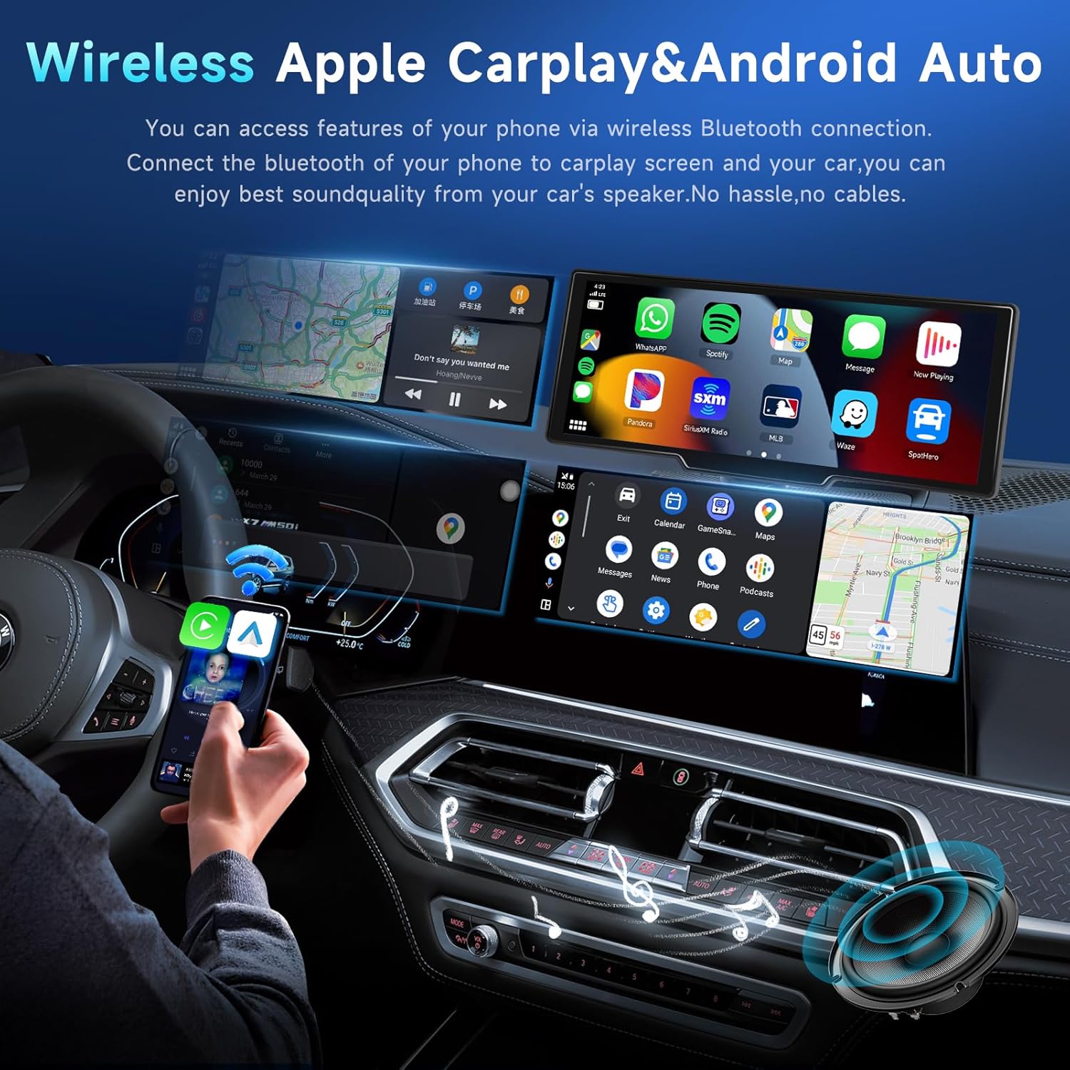 - 𝐔𝐩𝐠𝐫𝐚𝐝𝐞 𝐃𝐮𝐚𝐥 𝐁𝐥𝐮𝐞𝐭𝐨𝐨𝐭𝐡: This wireless carplay screen with the latest dual Bluetooth technology, connect your phone via Bluetooth to use wireless CarPlay and Android Auto on the portable car stereo. At the same time, pair your phone to the original car Bluetooth to play audio over the car speakers directly