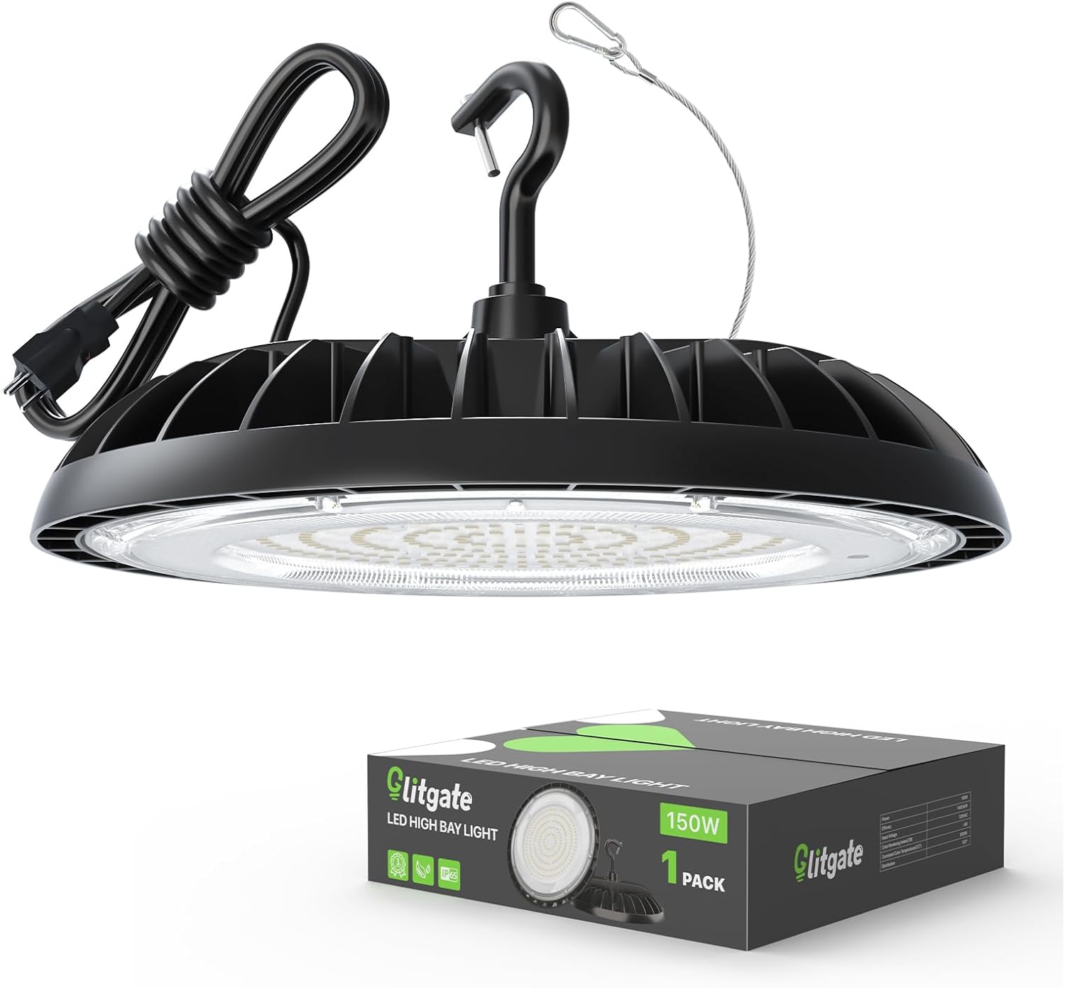 - Plug and Play: Equipped with J Hook and American Standard Plug, the high bay led shop lights are very easy to install. Save your time and effort at maximum. What’s more, safety rope can effectively avoid waggling or falling down.