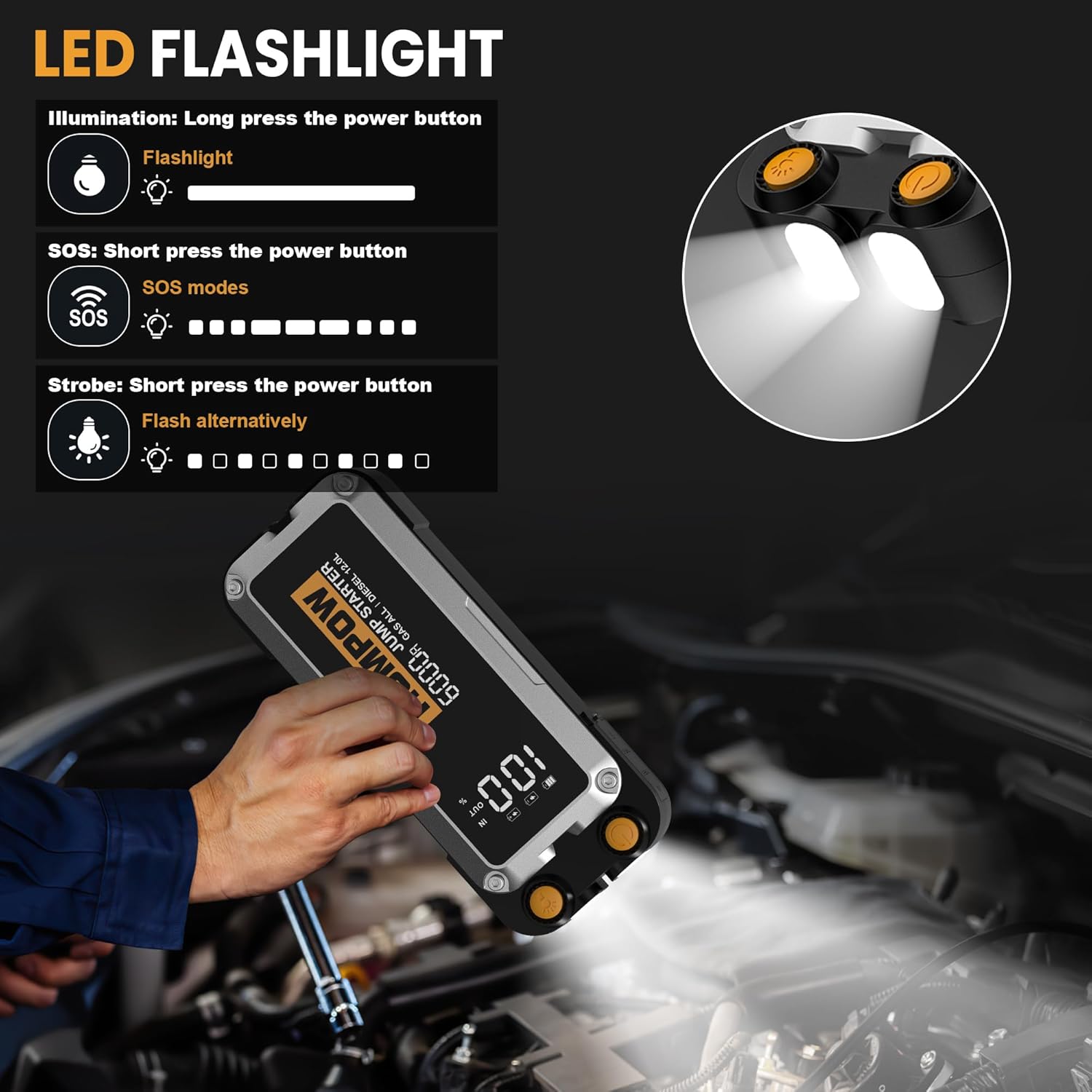- [ For All Gas Engines or Up to 12L Diesel Engines ] - HOMPOW car battery jump starter has a peak current of 6000A, which can quickly start all gasoline engines or vehicles with diesel engines up to 12L, and can start up to 60 times on a single charge, suitable for cars, trucks, motorcycles, boats, RVs or tractors, etc