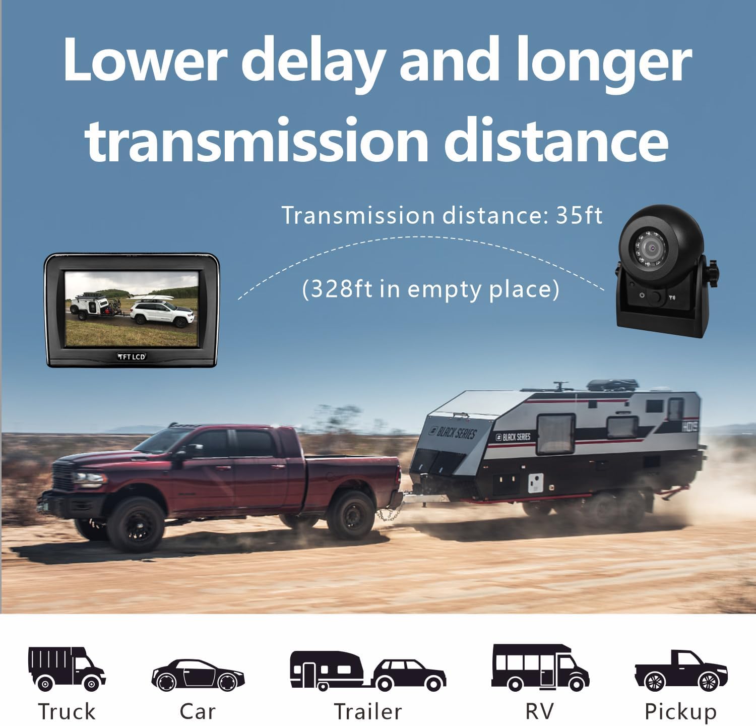 - Stable Signal Transmission and Wide Application--After upgrading the internal chip, this trailer backup camera with monitor has more stable signal transmission, lower delay and longer transmission distance, which can be up to 328ft/100m in empty place. You can use this rv backup camera kit on RV, horse trailers, boats, trucks, etc.