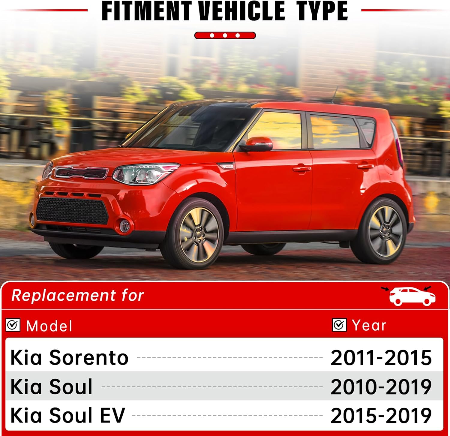 - Vehicle Service Type : Kia Sorento 2011-2015, Kia Soul 2010-2019, Kia Soul EV 2015-2019