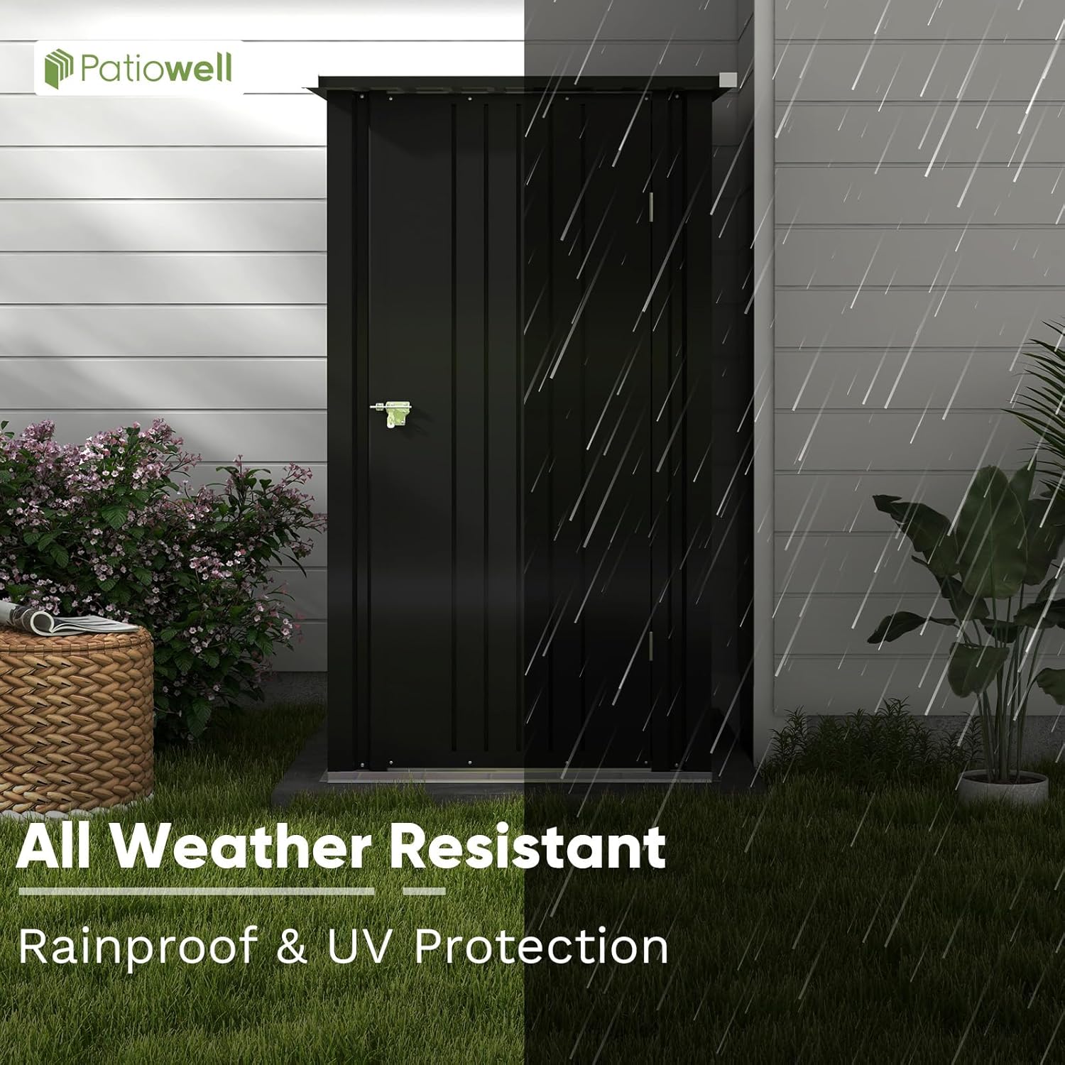 - Sloping Roof and Lockable Door: The sloping roof design can effectively prevent the accumulation of rainwater to avoid rust. The lower side of the door can ensure that the rainwater will not flow to the wall when the shed is placed against the wall. And the lockable door can ensure the safety of your property inside.
