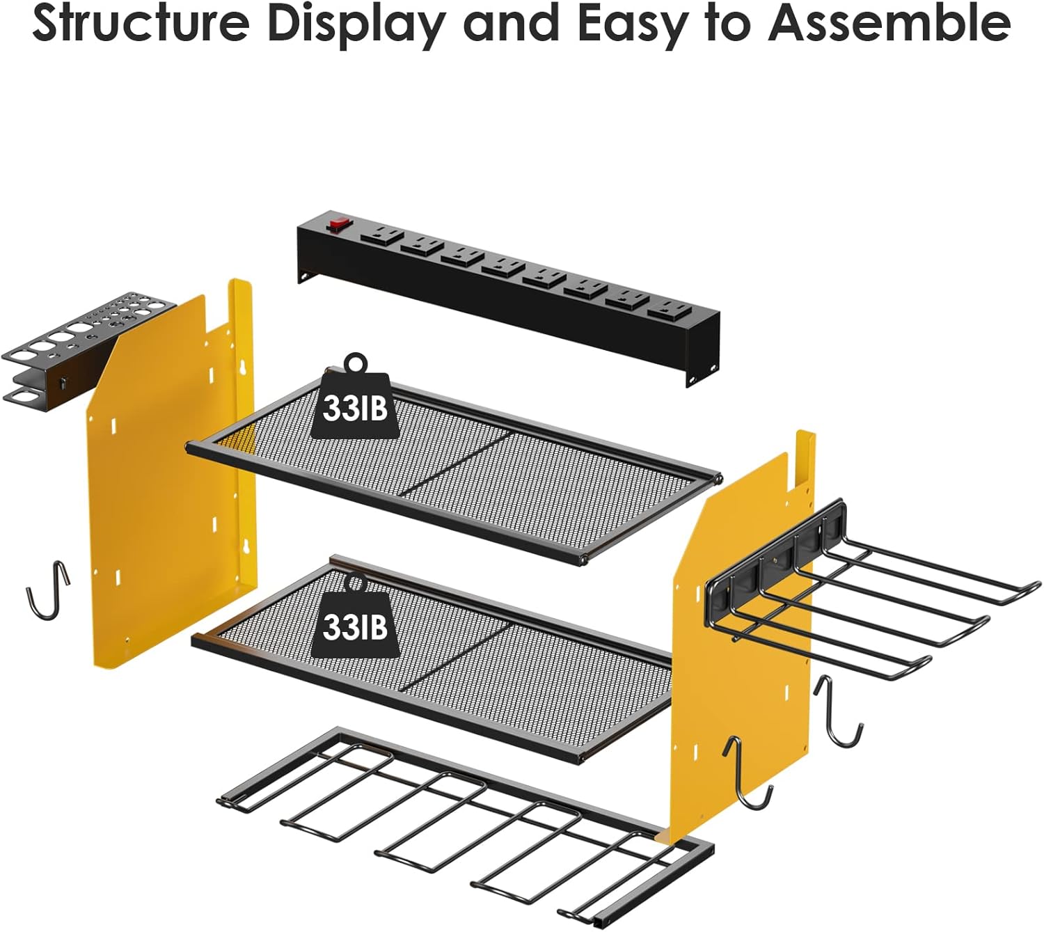 - Easy to assemble and can be mount on a peg board, If you need more storage space, you can connect the two shelves (or more) by screws. Each layer of the grid can support a maximum weight of 33IB. Made from heavy gauge steel. Amazing christmas or father's day gift for men.