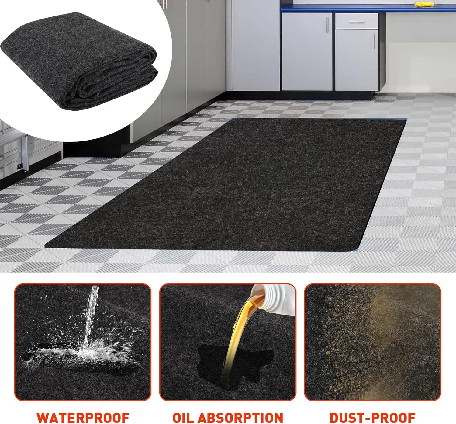 - ▶Waterproof and Oil Absorption◀ The top of the waterproof oil absorption pad is made of non -woven polyester fiber. It is flat and soft, which can quickly absorb and capture a large amount of oil. The bottom of the waterproof rubber backing is used to prevent water and oil stains from penetrating, thereby protecting the floor of the garage.