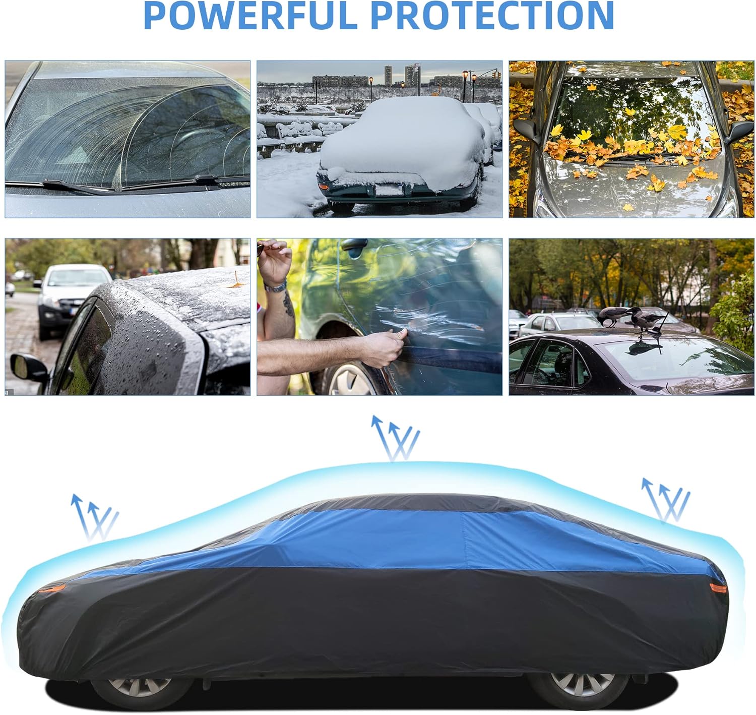 - 【Powerful Functions】1> 4Pcs reflective stripes remind other people in the night, avoid accident in dark environment 2> The elastic hem at the bottom makes the car cover fit the car better 3> Windproof straps can prevent the cover from being blown away by the heavy wind 4> Double stitch technology which makes the fabric stitched tighter&non-tearable, more durable than other similar covers.