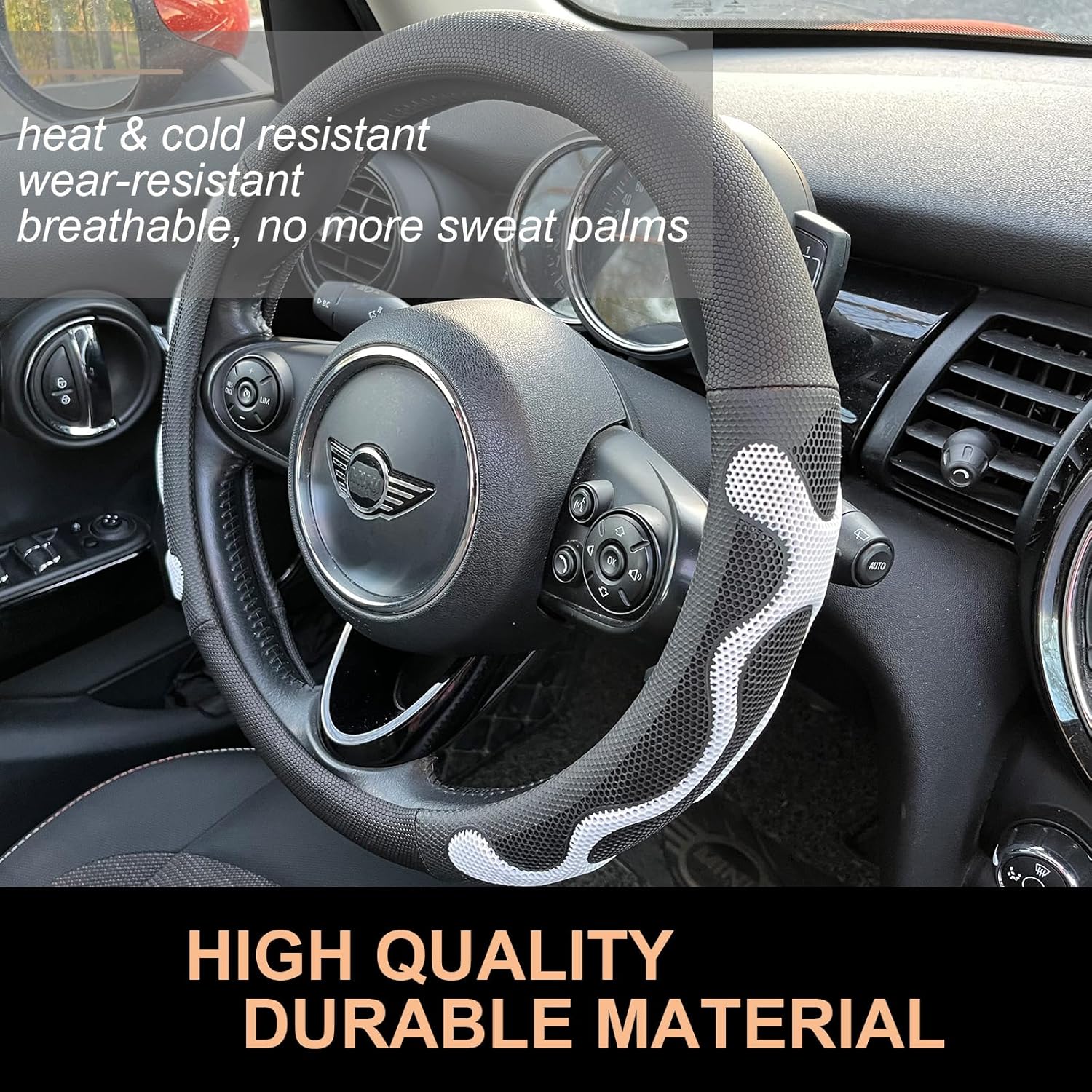 - Built to Last: Crafted with a solid rubber inner circle, textured microleather leather, and a 3D honeycomb silicone grip, this cover boasts a unique material combination that ensures exceptional durability. The silicone grip effectively relieving sweaty hands under hot weather. Enjoy a long-lasting and comfortable grip with PINCTROT car steering wheel cover.