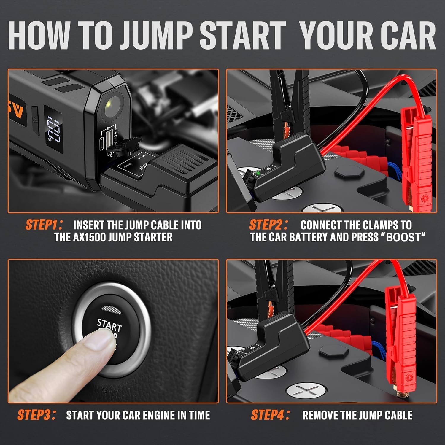 - 【10 Upgrade Protections】: AX1500 battery jump starter has 10 different safety features, , frees your worries of misuse and sparks. The zero voltage start function is a safety protection technology by the AX1500 jump starter, Even if the battery voltage is too low (below 0V), pressing the “BOOST” button will force the car to restart.