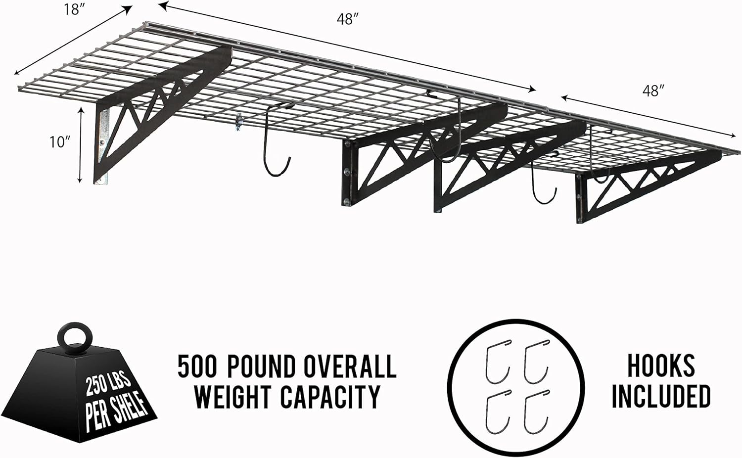 - MULTIFUNCTIONAL UTILITY RACK: Each pack includes (2) wall shelves and (4) versatile deck hooks that allow you to use them in many ways. Use them as storage racks and shelving in your basement, garage, pantry, or laundry room, and confidently hang your bicycle, golf accessories, canned goods, or yard tools and more to gain usable floor space.