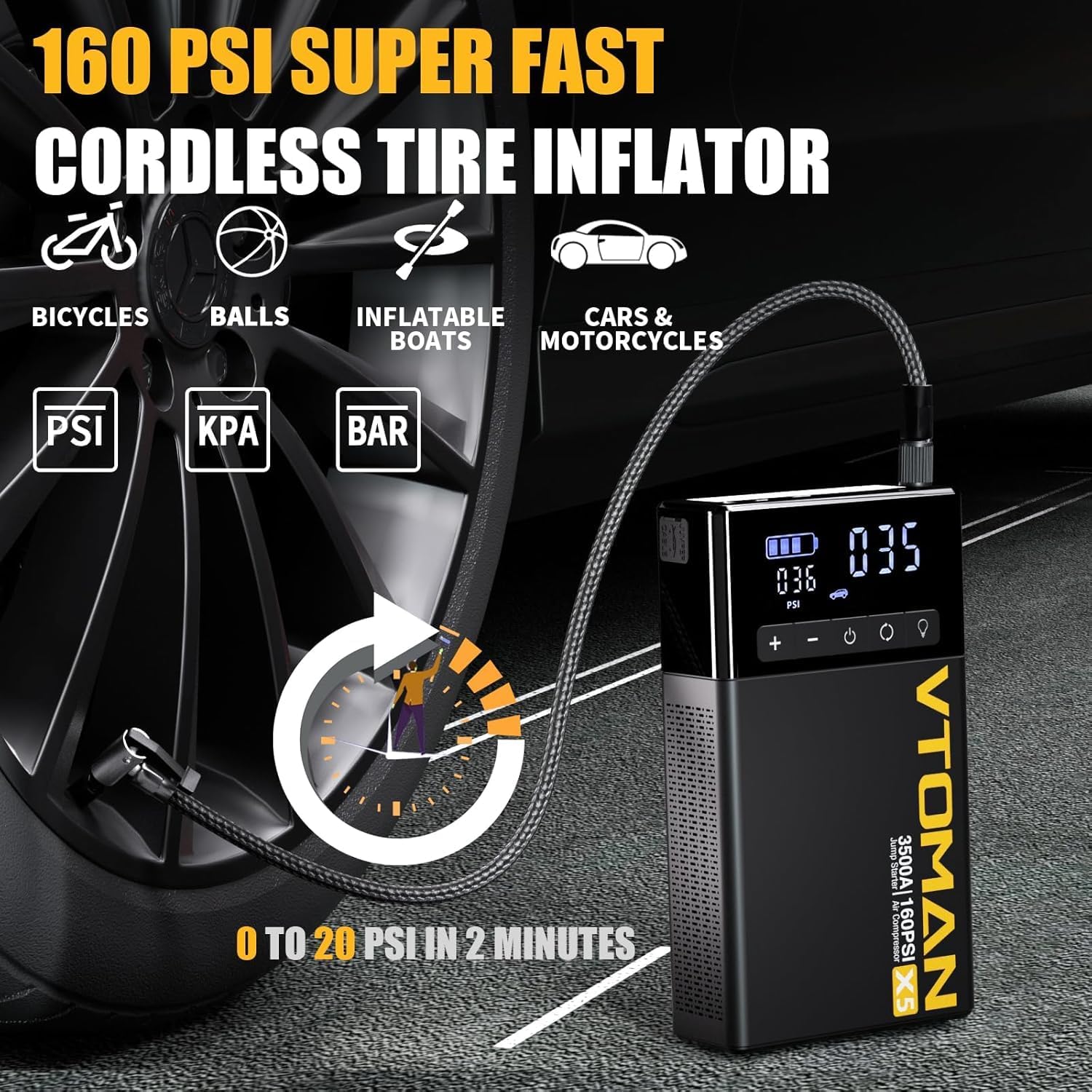 VTOMAN X5 Jump Starter with Air Compressor, 3500A Portable Car Battery Booster (Up to 9L Gas/8L Diesel Engines) with 160PSI Digital Tire Inflator, 12V Lithium Battery Jump box with Type-C Quick Charge