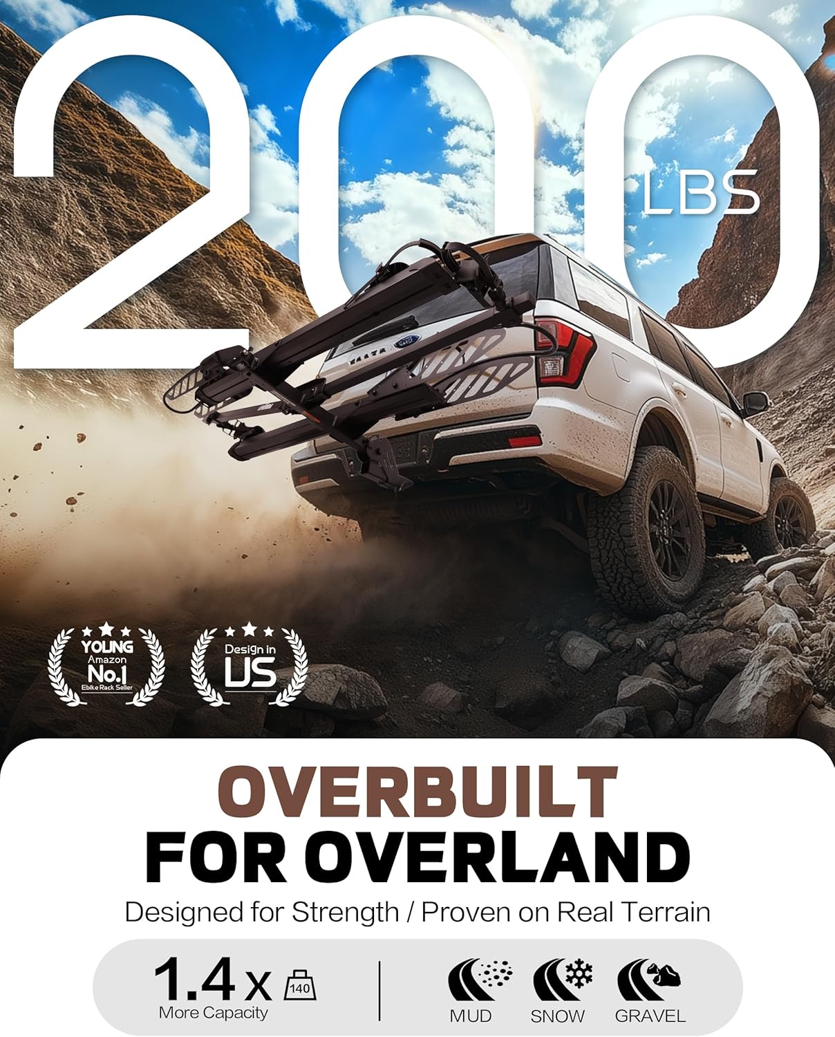 - HEAVY DUTY CAPACITY 200LBS: With a maximum weight capacity of 200lbs, our foldable electric bike rack with 2 separate support rods can easily accommodate 2 bikes or electric bikes, each weighing up to 100lbs. Compatible with bikes and e-bikes with tires within 5", it comes equipped with adjustable sliders that ensure a perfect fit for different wheelbases (Max 50''). Say goodbye to wobbly bike racks and hello to a secure and stable ride.