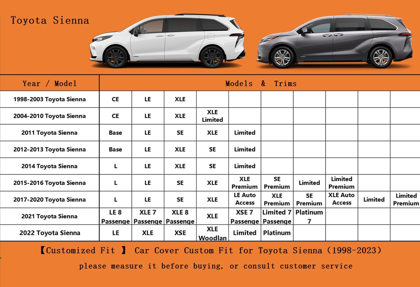 - 【Suitable for】— Custom fit for Toyota Sienna (1997-2025). Come with a large enough portable bag to store your cover when you do not use