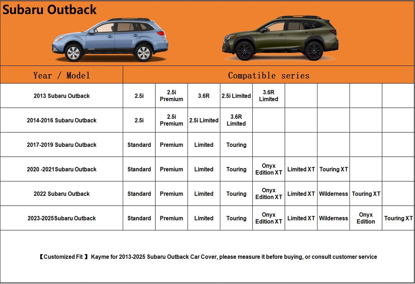 - 【Suitable for】— Custom fit for Subaru Outback (1994-2025). Come with a large enough portable bag to store your cover when you do not use
