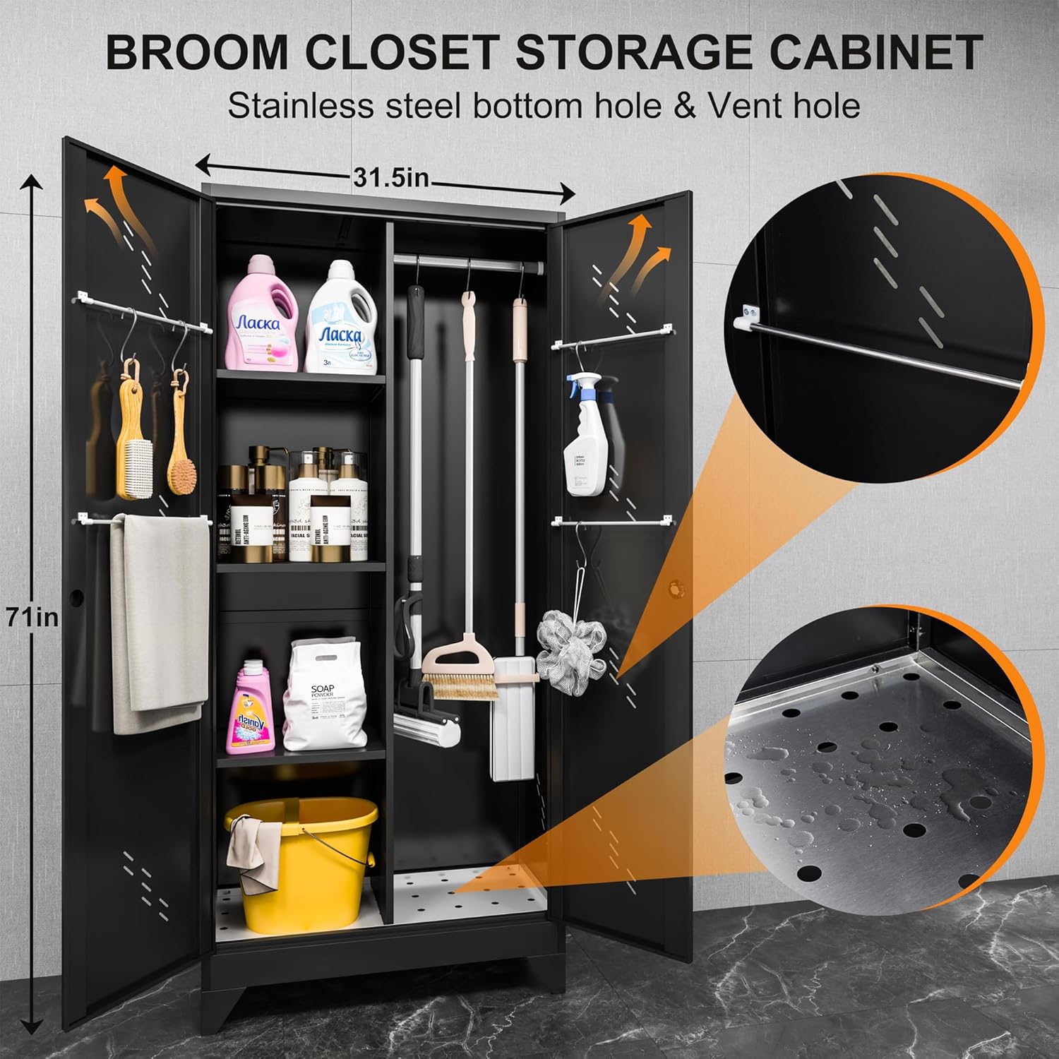 - 【Unique Design】The metal storage cabinet has holes in the bottom.The bottom plate is made of stainless steel. Prevent corrosion and rust, hardness is higher than other materials.You can put wet mops and brooms in this broom closet.Make your tools and room more tidy.