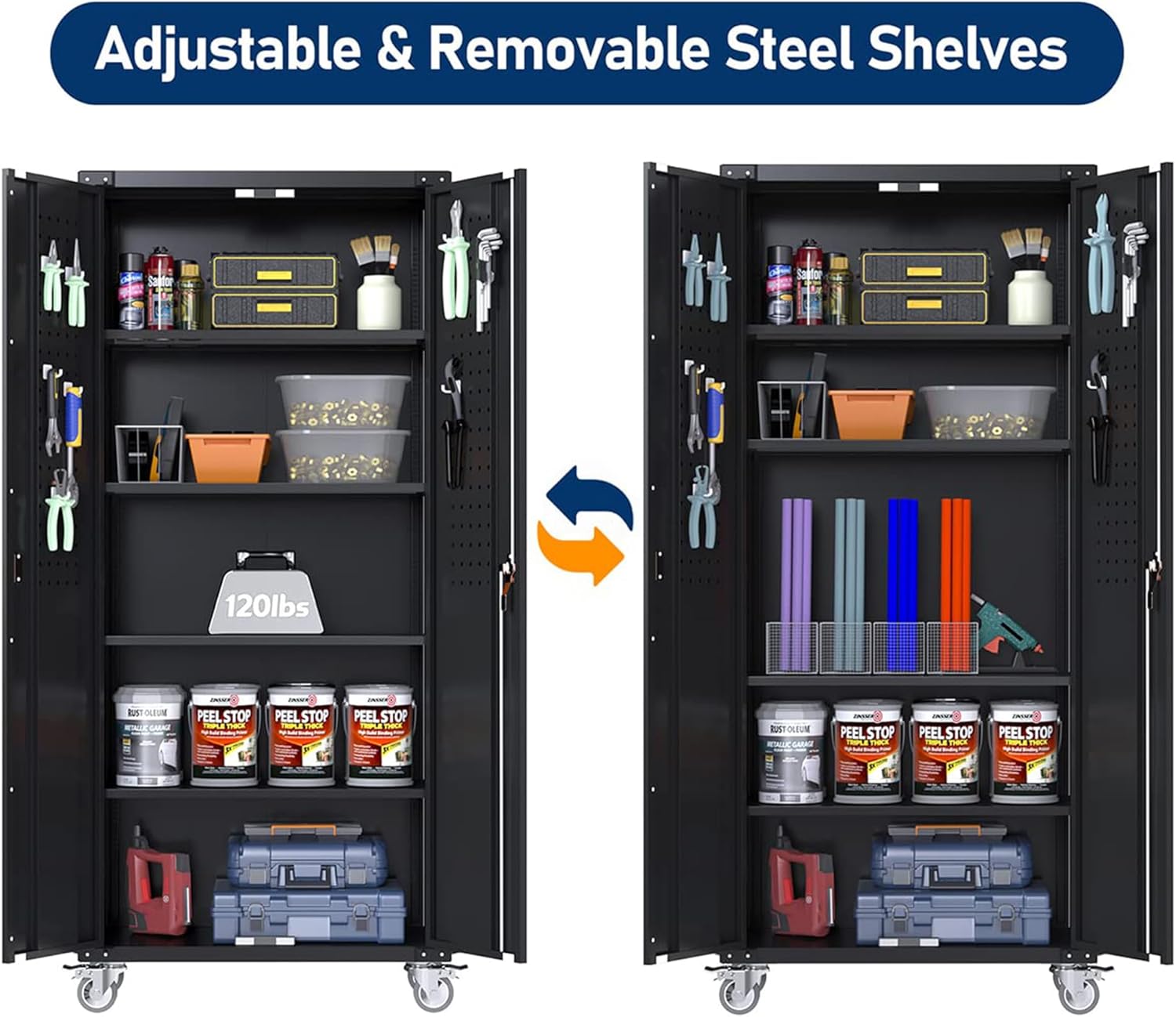 - 【Utility Pegboard & Adjustable Shelves 】Redesign your organizing ways, hang up everything on the door, get effortless accessible for a variety of small hardware, no more searching for things among the clutter. Tall Garage storage cabinet with wheels is designed with 4 adjustable shelves, you can easily meet your different storage needs by adjusting the height between the shelves.