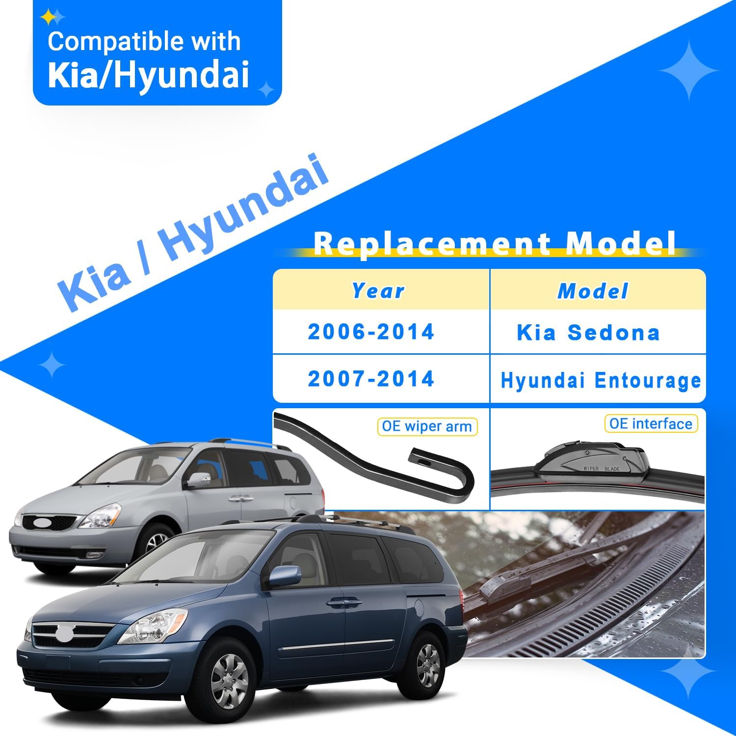 - {FITMENT2}: Replacement for 2007 2008 2009 2010 2011 2012 2013 2014 Hyundai Entourage 26inch + 18inch front with 16inch rear windshield wiper blades.