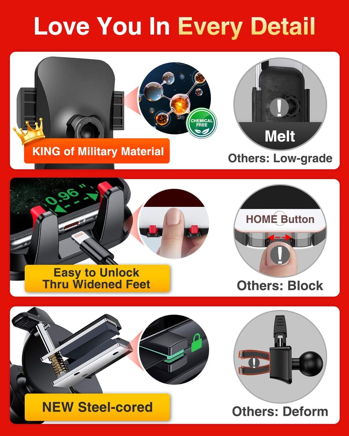 - 【🥇BEST Newest Car Phone Holder】VANMASS's best car phone mount with the highest rating! Preferred by 3,500,000+ Customers; Designed by world-class professional team; enjoy EUIPO Patent (No.007708805-0001), Military-grade certificate (No. GZMR220601855501), CP65/REACH/ROHS; 4,000+ kinds of material selection, 500+ suction cup upgrade designs, and 20,000 miles of road tests; giving birth to the best combo of the Flagship&Classic hoolder with newest suction cup;