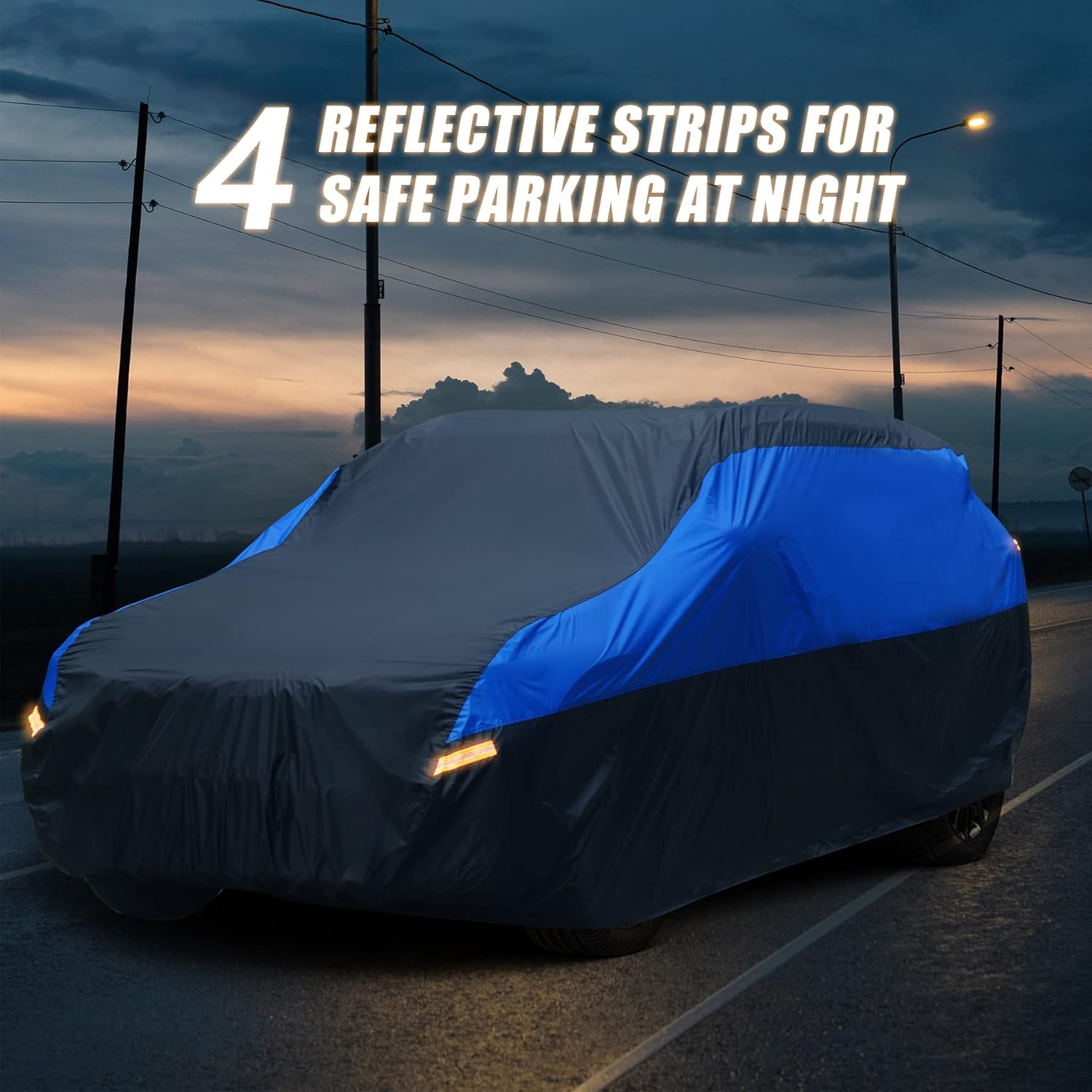 - 【Powerful Functions】1> 4Pcs reflective stripes remind other people in the night, avoid accident in dark environment 2> The elastic hem at the bottom makes the car cover fit the car better 3> Windproof straps can prevent the cover from being blown away by the heavy wind 4> Double stitch technology which makes the fabric stitched tighter&non-tearable, more durable than other similar covers.