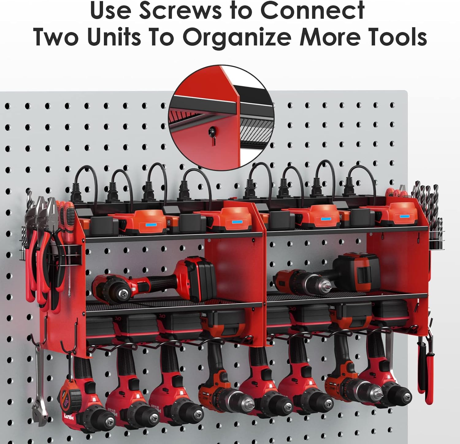 - Power tool organizer with charging station, come with 8 outlets. If you have a lot of rechargeable tools, you can charge everything right in the rack and avoid searching for sockets. 6ft power cord included.