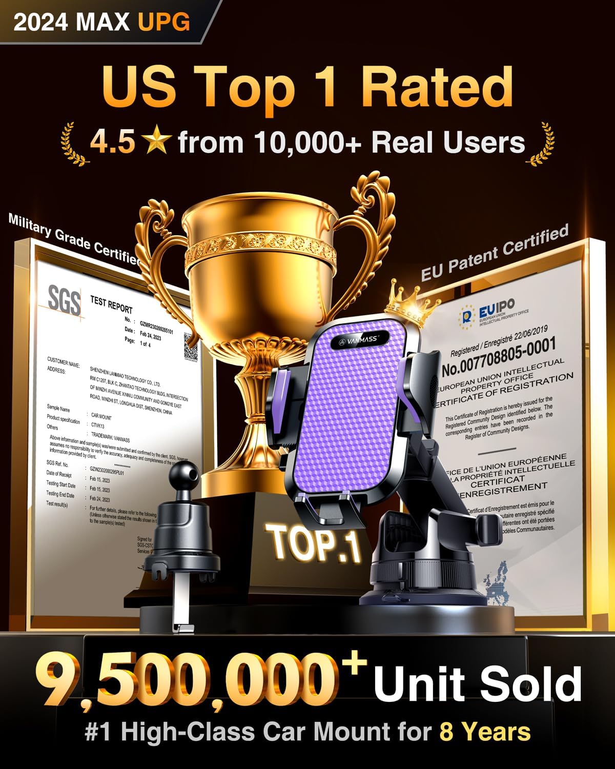 - 【True Military-Grade Certified, Upgraded Ultimate Car Mount】VANMASS, the leader in high-end car phone holder. Over the past 8 years, We have listened to the voices of millions of users, rigorously tested to MILITARY GRADE standards (stability, compatibility, flexibility, security, durability). Finally, we overcome all weaknesses to design the Ultimate Model that we are most satisfied with. This item obtained international military-grade shockproof certification No. GZMR220601855501