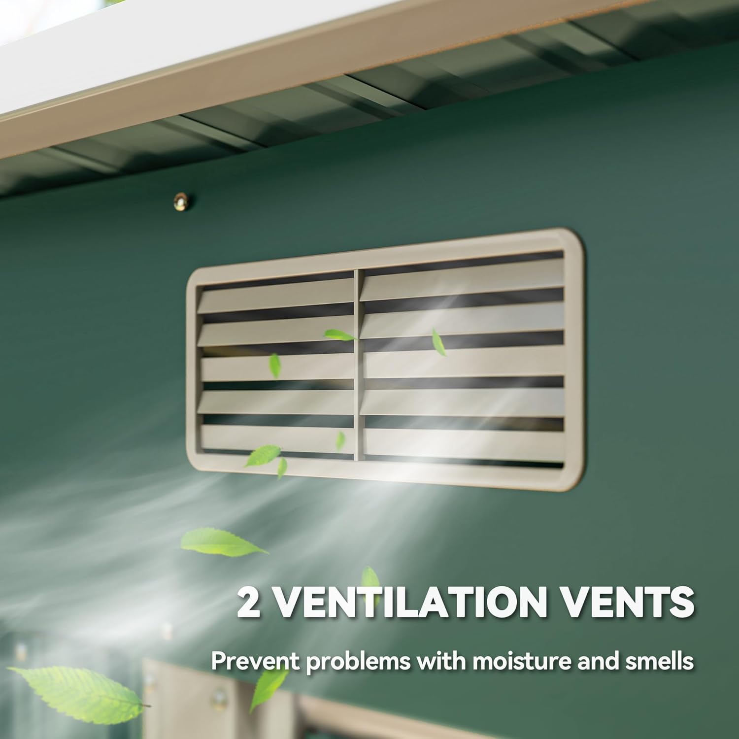 - Good Ventilation and Lockable Door: Our metal outdoor storage sheds feature two ventilation slots on the front and back, increasing airflow. This prevents odor and keeps your equipment and tools dry. Its lockable door protects items from would-be thieves.
