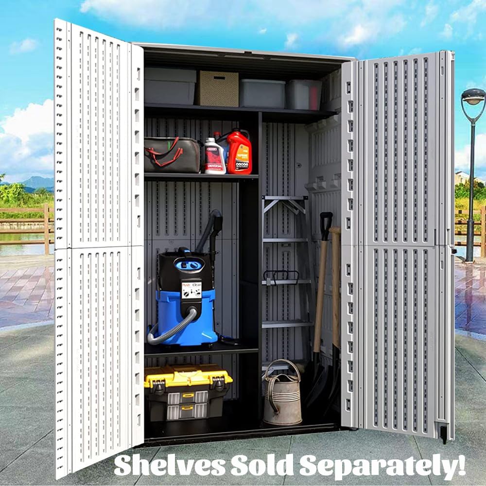 ADDOK Vertical Outdoor Storage Shed with Floor, 54 Cu Ft Outdoor Storage Cabinet with Lockable Double Doors, All-Weather Durable Plastic Construction for Patio, Backyard, Lawn and Garden, White