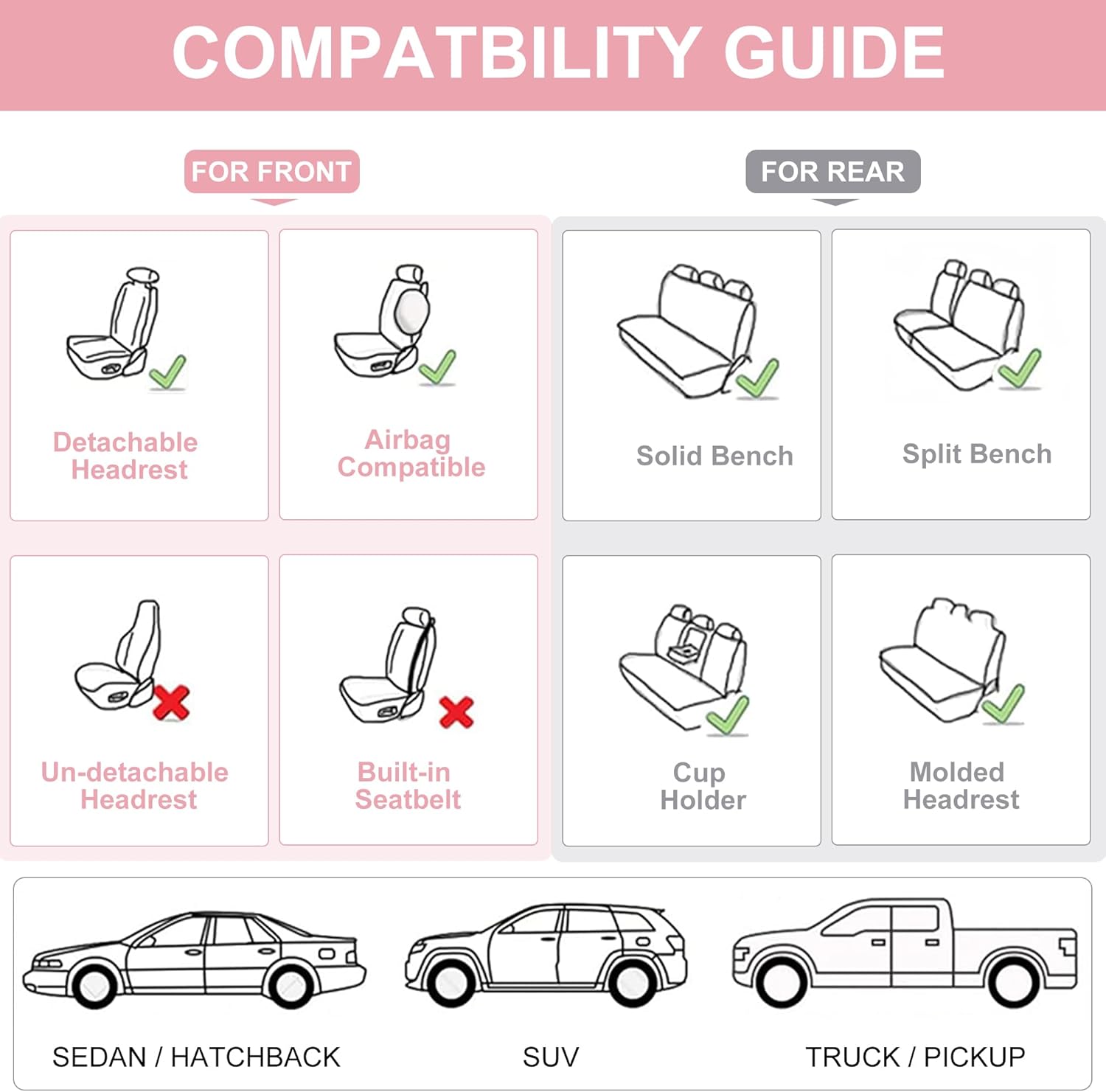 - Universal Car Seat Covers: Our seat covers are designed to fit most vehicles, including sedans, trucks, vans, and SUVs. If you are not sure whether the covers are suitable for you, please inquiry BWTJF customer service team