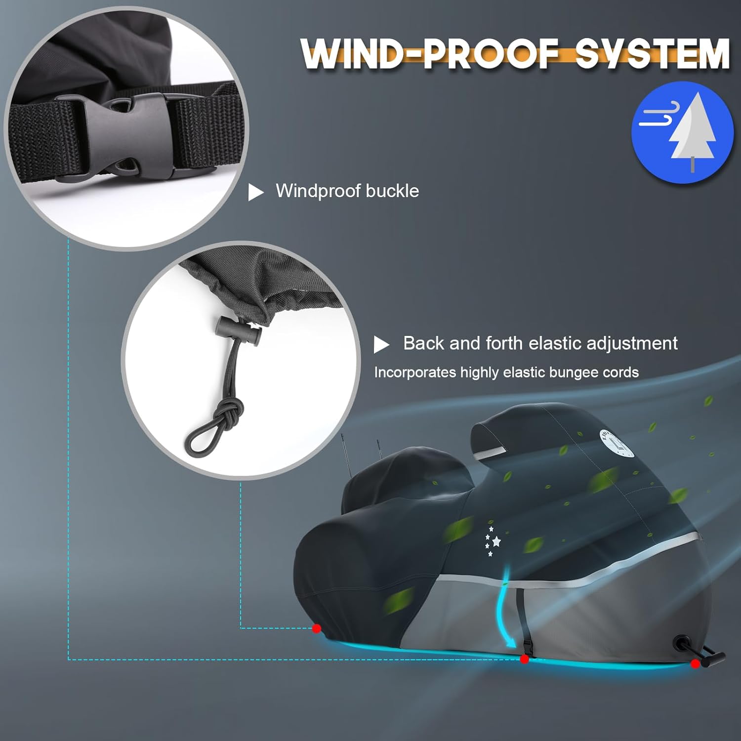 - Details Improvement : Adjustable elastic band is added to the whole circle of the bottom of the motorcycle cover, with an adjustable windproof buckle in the center, which can be adjusted to make the cover and the motorcycle tighter. In addition, the front section of the cover has an ABS lock hole.