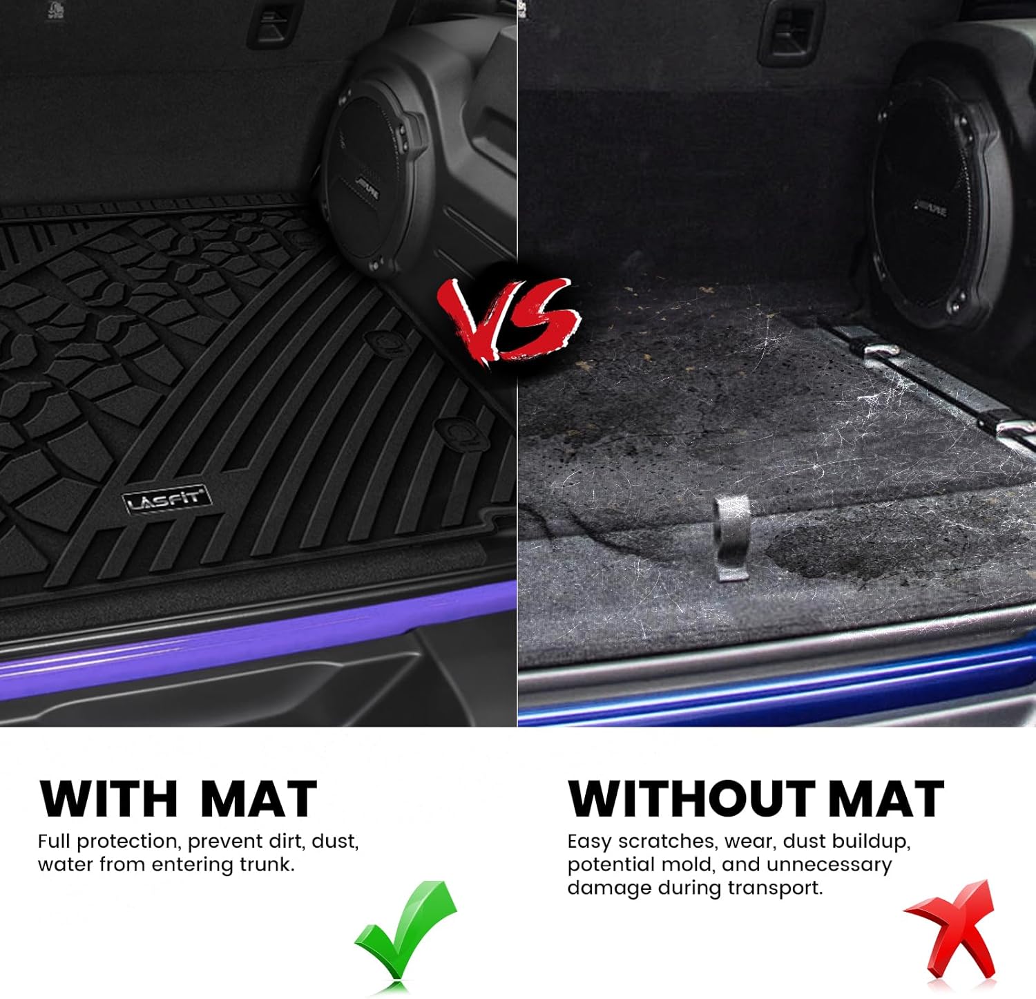 - LASFIT LINERS - Compatible for Jeep Wrangler JL 2018-2025. Cargo mat fit models with Flat Load Floor. Only fit models equipped with a Subwoofer. Fit for Gas Type and MILD HYBRID EV-GAS (MHEV) (Not for JK / Not 2-Door / Not PLUG-IN HYBRID EV-GAS (PHEV))