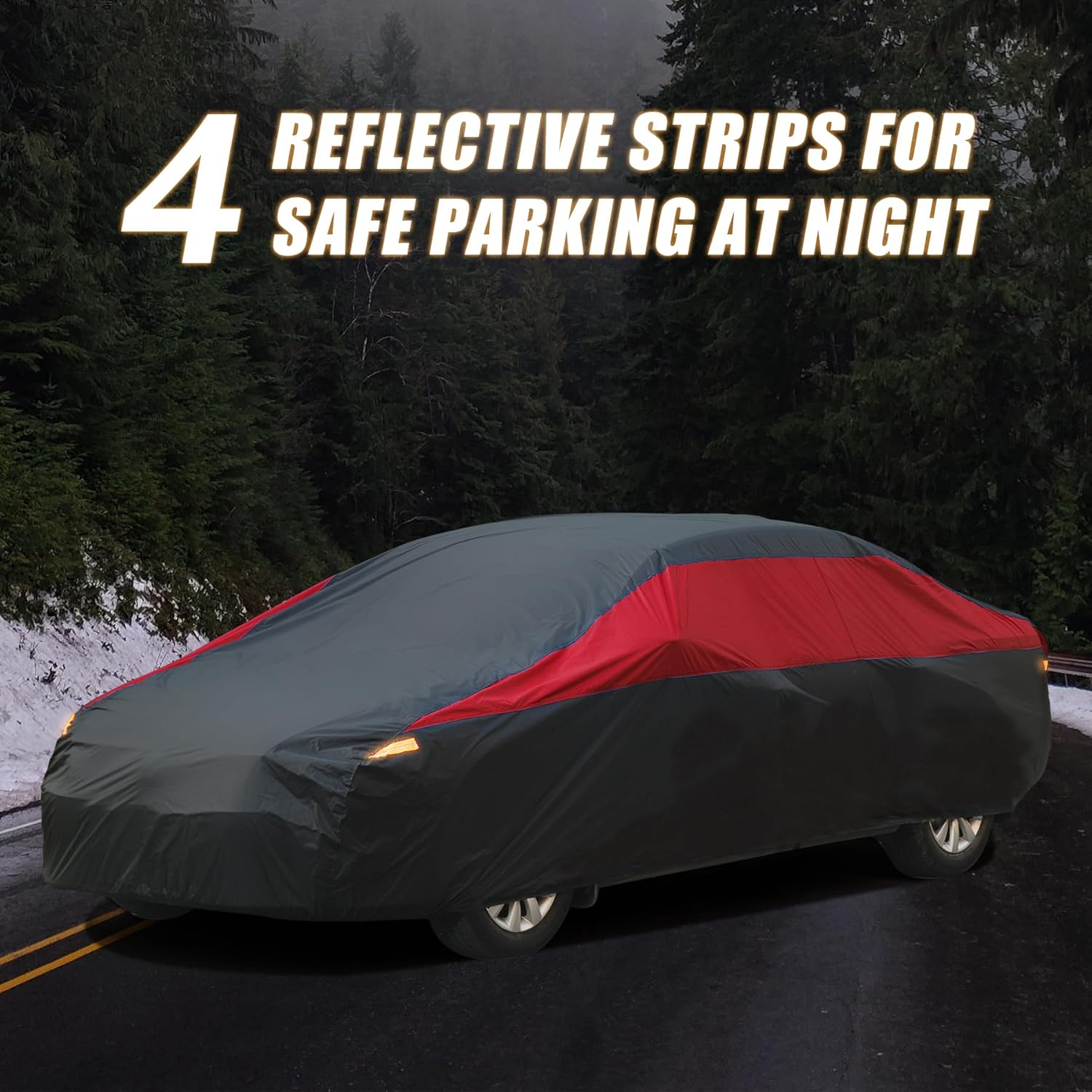 - 【Powerful Functions】1> 4Pcs reflective stripes remind other people in the night, avoid accident in dark environment 2> The elastic hem at the bottom makes the car cover fit the car better 3> Windproof straps can prevent the cover from being blown away by the heavy wind 4> Double stitch technology which makes the fabric stitched tighter&non-tearable, more durable than other similar covers.