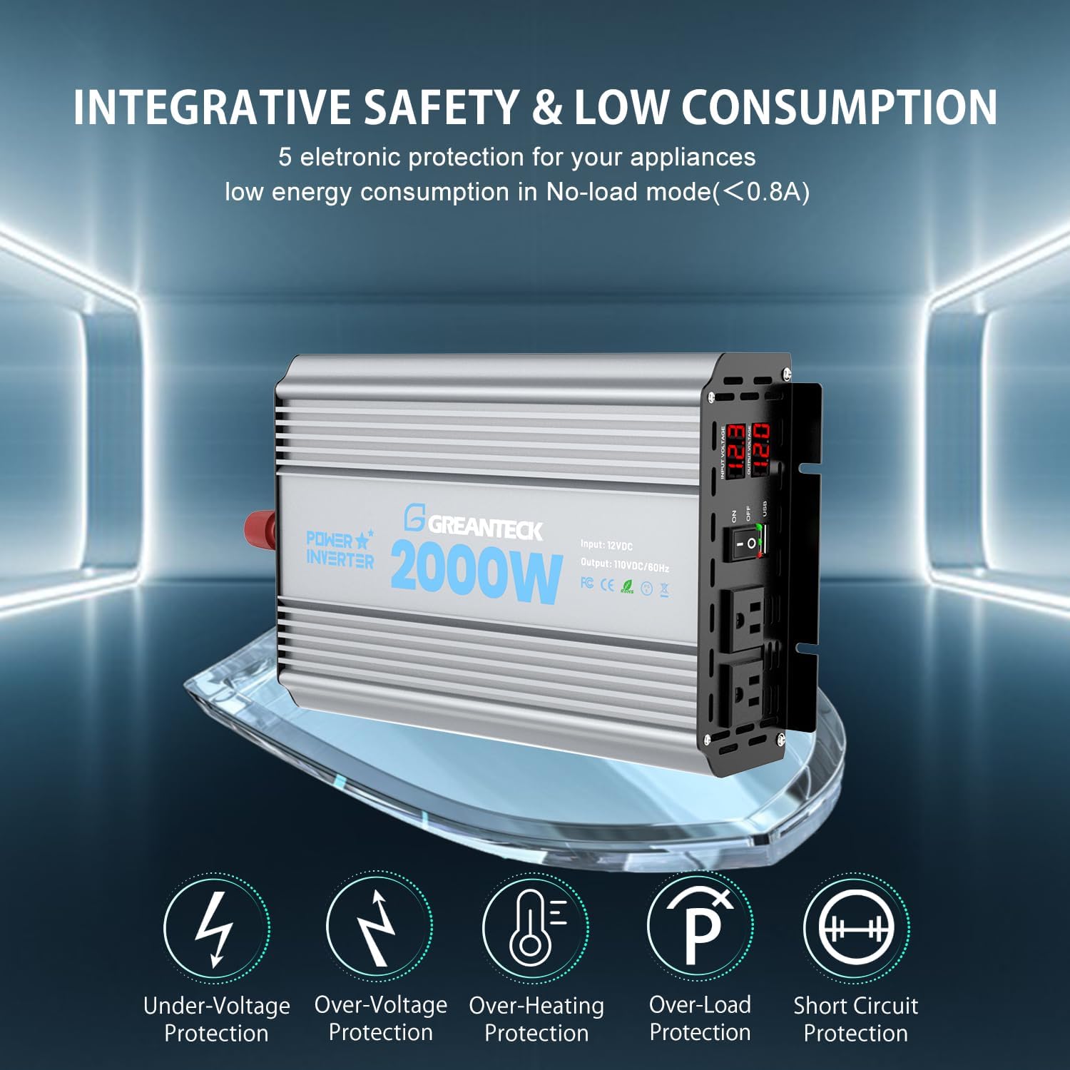- [ADVANCED TECH] GREANTECK Modified sine wave inverter provides true 2000W continuous and 4000W peak power. 12V DC to 110/120VAC modified sine wave tech save more energy from high conversion efficiency (>80%) and low no-load loss.