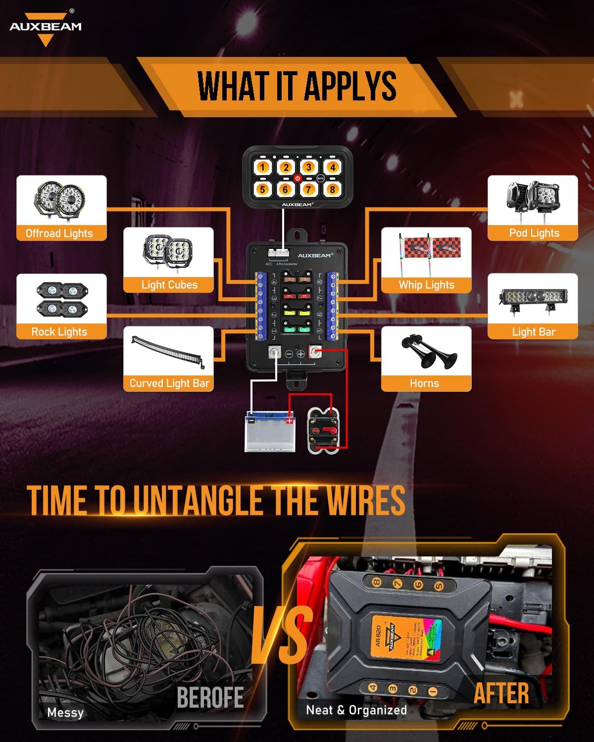 - Solid-State Relay & Enhanced Safety : Auxbeam RGB 8 gang switch pod built-in solid-state relays and circuit breakers ensures stable power delivery and overload protection. Dustproof covers, 60+ stickers, and plug-and-play wiring (10ft extension) make installation effortless. Ideal for off-road lighting systems, it’s engineered for reliability.