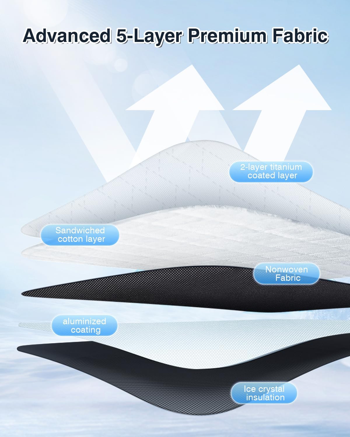 - 【5-Layer Insulation】Advanced 5-layers material, effectively block 99% UV rays and heat, reducing temperature by up to 50-59°F. Keep your vehicle inside cool and prevents the inside of your car from over-heating.