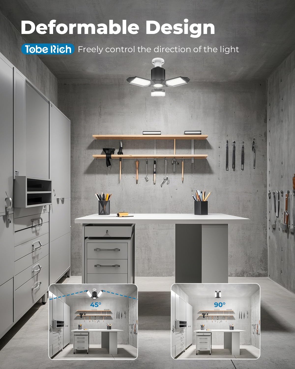 - 𝘿𝙚𝙛𝙤𝙧𝙢𝙖𝙗𝙡𝙚 𝘿𝙚𝙨𝙞𝙜𝙣: Our deformable LED garage lights feature adjustable panels that can be angled up to 90 degrees, allowing you to customize the direction of your lighting to suit your needs. Besides, with a wide-angle and multi- panels design, these garage LED lights provide broad coverage, illuminating even the darkest corners of your garage or workshop