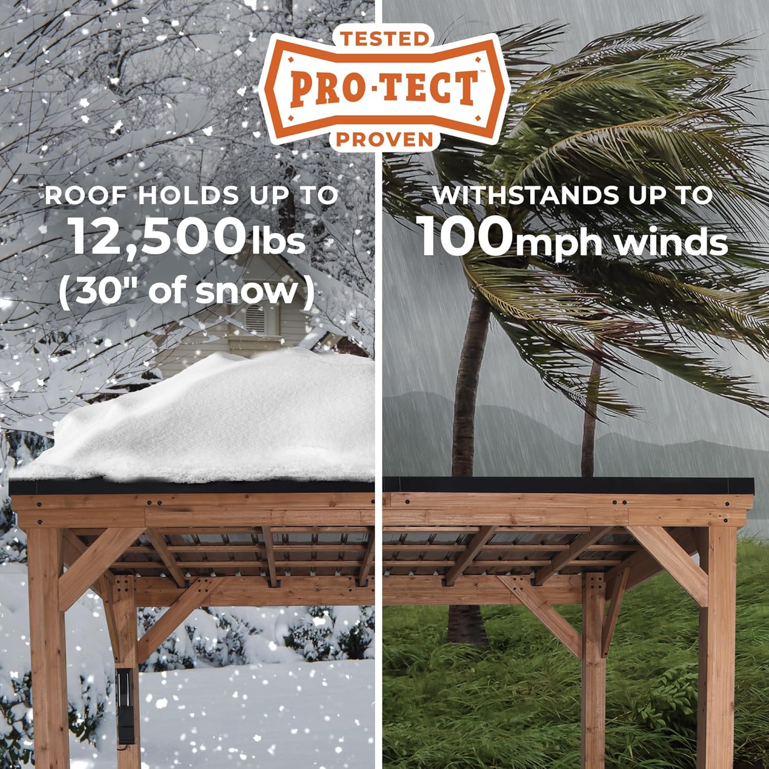 - All-Weather Durability: Pro-Tect tested and proven to withstand up to 12,500 pounds or up to 30 inches of snow load, and winds up to 100 mph (product must be anchored as specified in the Backyard Discovery instruction manual)