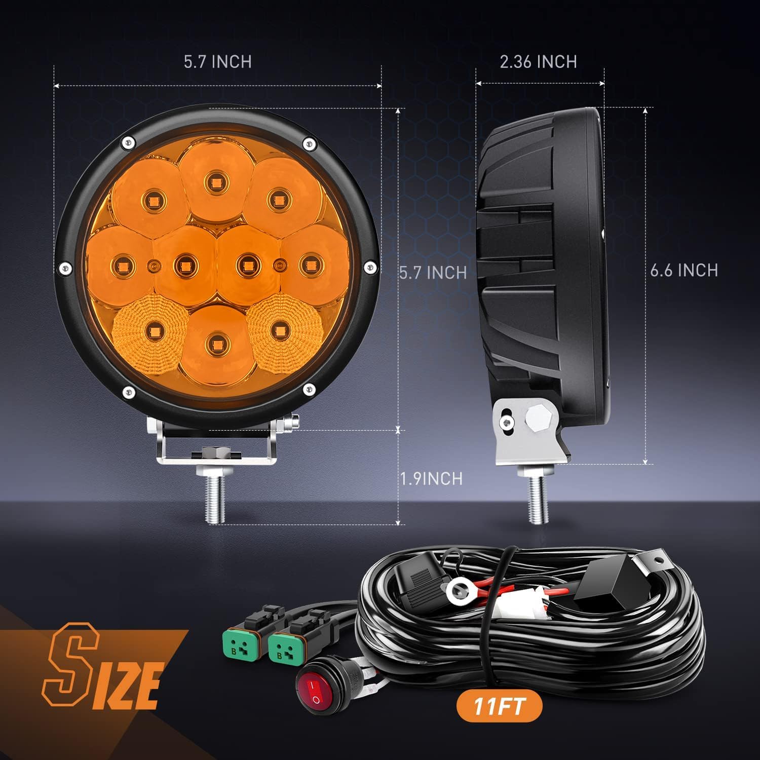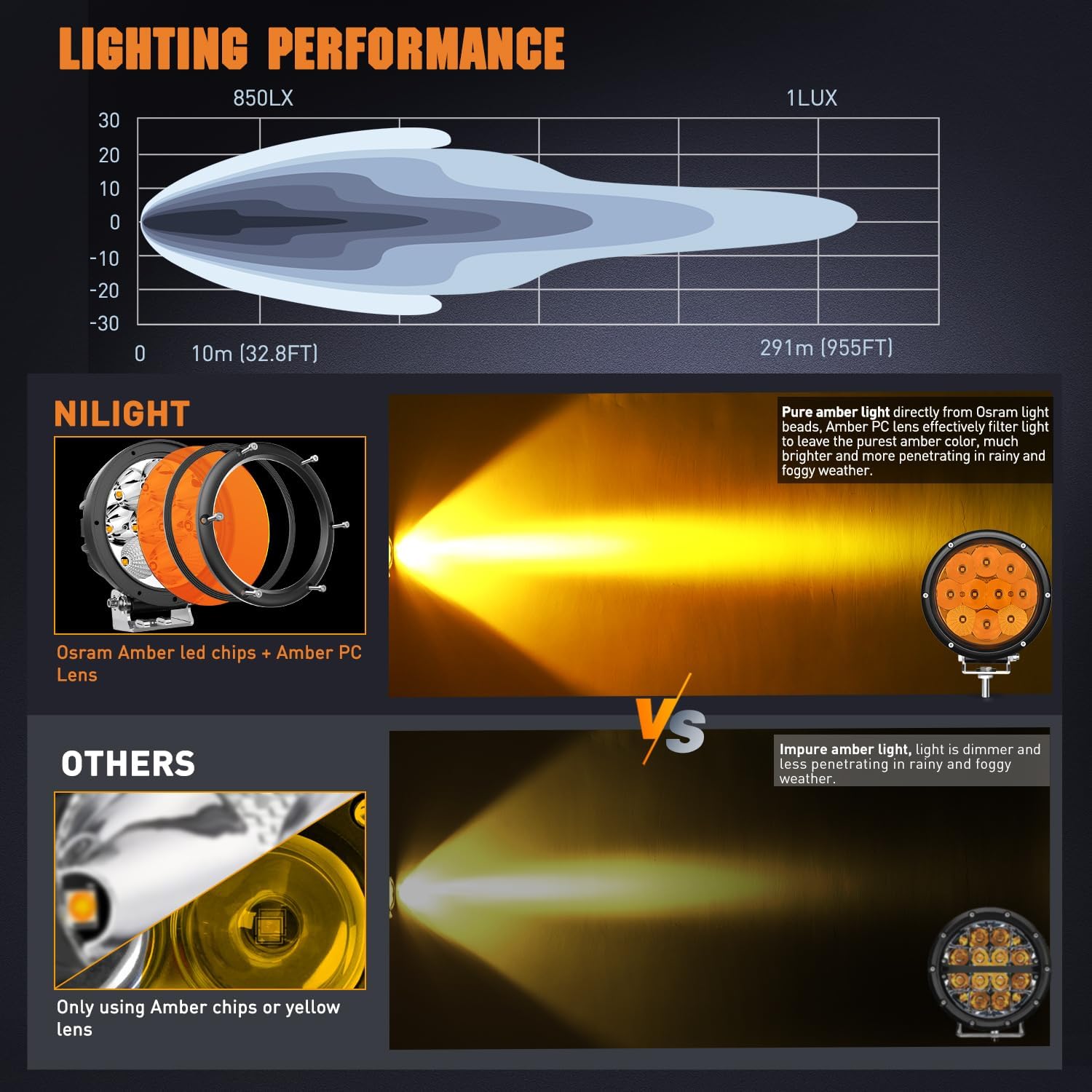 - 【Ultra Insane Brightness】Each light use 10PCS high quality 5W Osram led chips, total 50 watts, specially designed optical yellow lens and refractive cup, outputs super bright 1958K amber light, 850Lux@10M, 1Lux@ 954.7FT. Providing you a more clearly and safe driving in foggy snowy, rainy weather, preventing the fog/snow/dust from reflecting the light back into driver's eyes