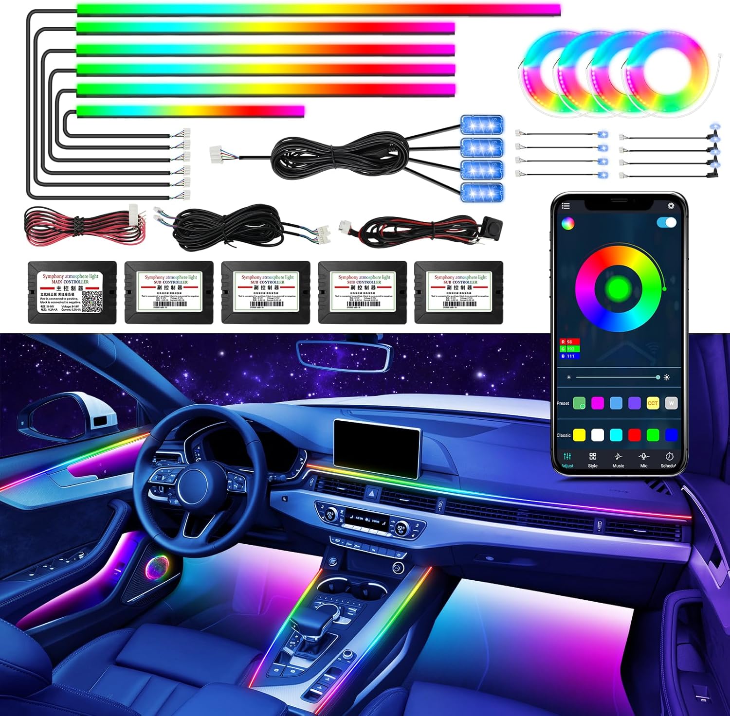 - 【 Dreamcolor Car Ambient Light】 This interior car LED light consists of 6 acrylic fiber optic light strips (1*14inch+4*29inch+1*43inch, with 593 LEDs), 4 under dash lights, 4 door handle light, 4 door storage box light, 4 woofer lights, one master controller and 4 slave controller, which can be flexibly installed in any car. The dreamcolor lighting effect of the upgraded can bring you a different experience.