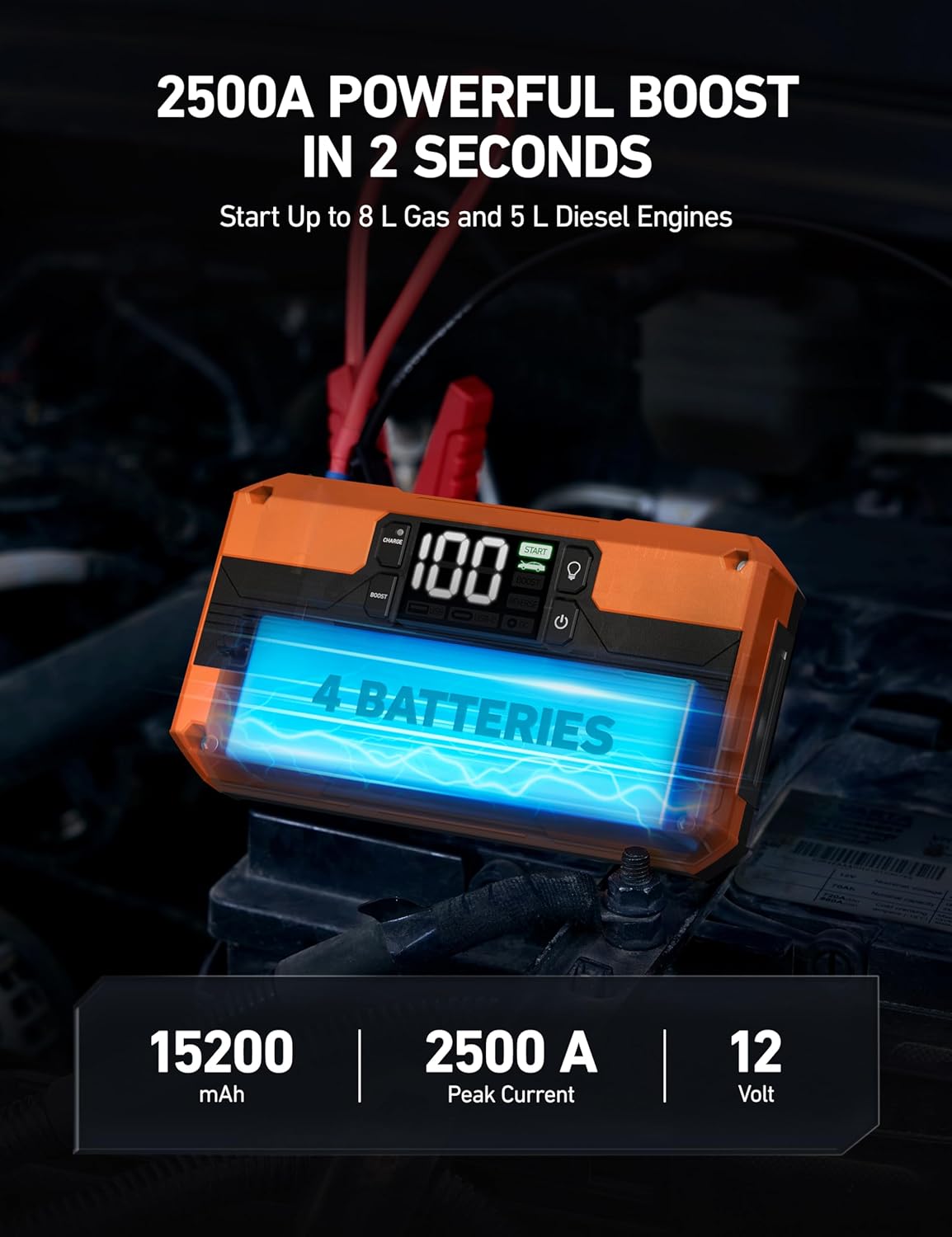 - POWERFUL BOOST IN 2 SECONDS: This car battery jump starter has 4 battery cells with a 2500 A peak current, capable of quickly starting low voltage and fully-drained batteries within 2 seconds. The built-in 15200 mAh battery can start up to 8 L diesel engine/5 L diesel engine and other 12 V vehicles like motorcycles, cars, pickups, trucks, etc. Ensuring you can safely adventure off-grid with peace of mind.