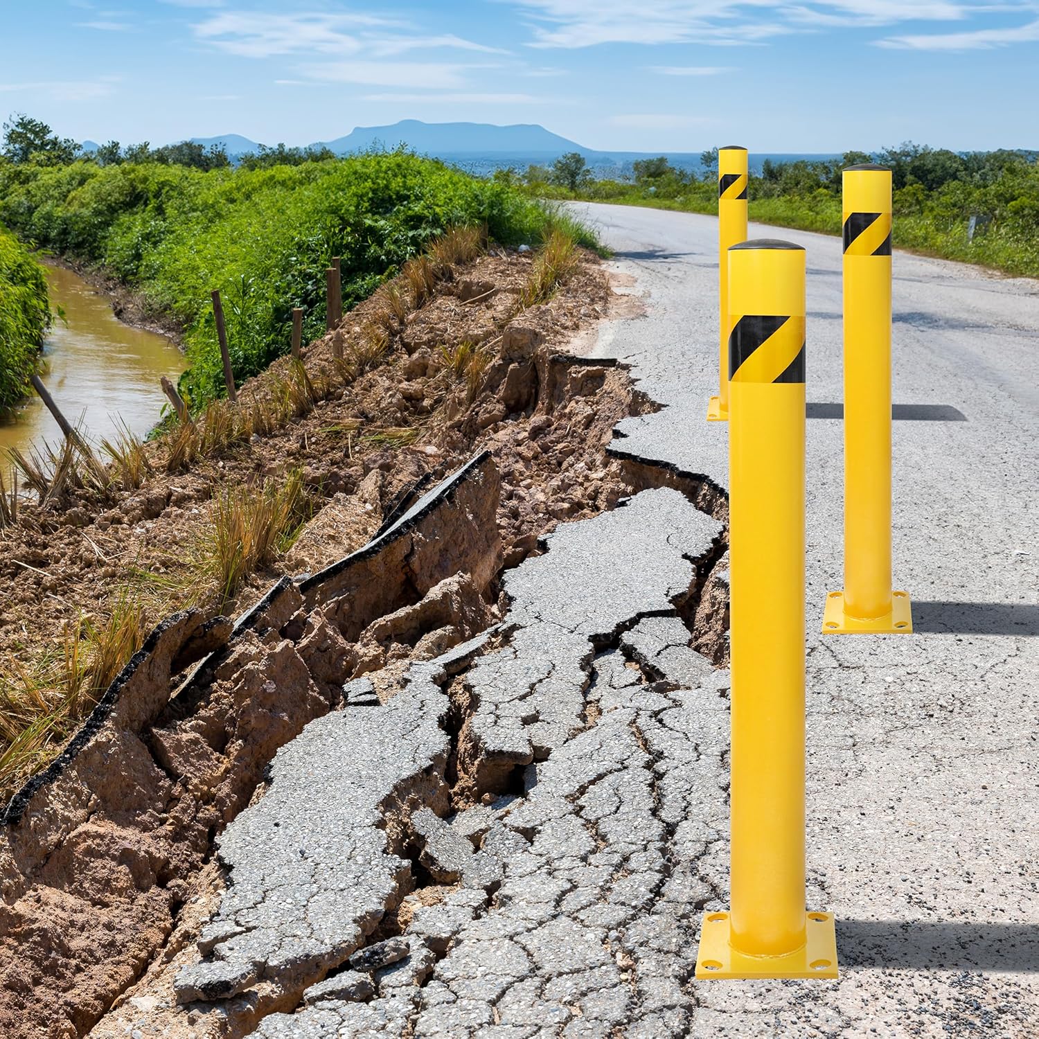 - [Enhanced Visibility]: Powder-coated bright yellow finish; Tops of our bollards are wrapped in 3in (7.6cm) black and yellow Department of Transportation compliant reflective tape for nighttime visibility