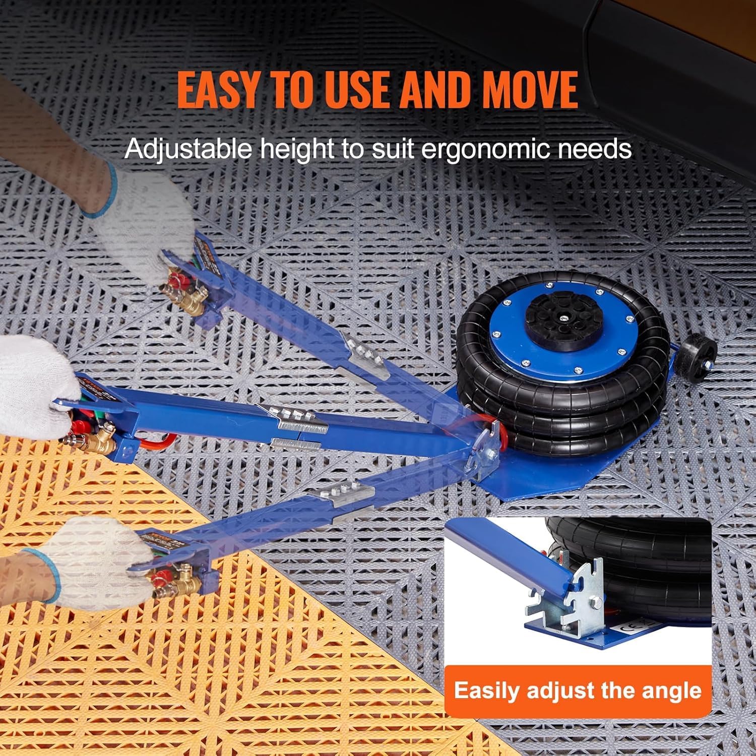 - Effortlessly Operation: Ergonomic design features an adjustable long handle and two casters for effortless maneuverability. You can adjust the angle of the handle for convenient operation, allowing you to position the air bag jack beneath your vehicle without straining your back. The valves are located on the handle for efficient lifting, and by simply connecting the air compressor and operating the valve, our airbag jack can be lifted within a mere 5 seconds.