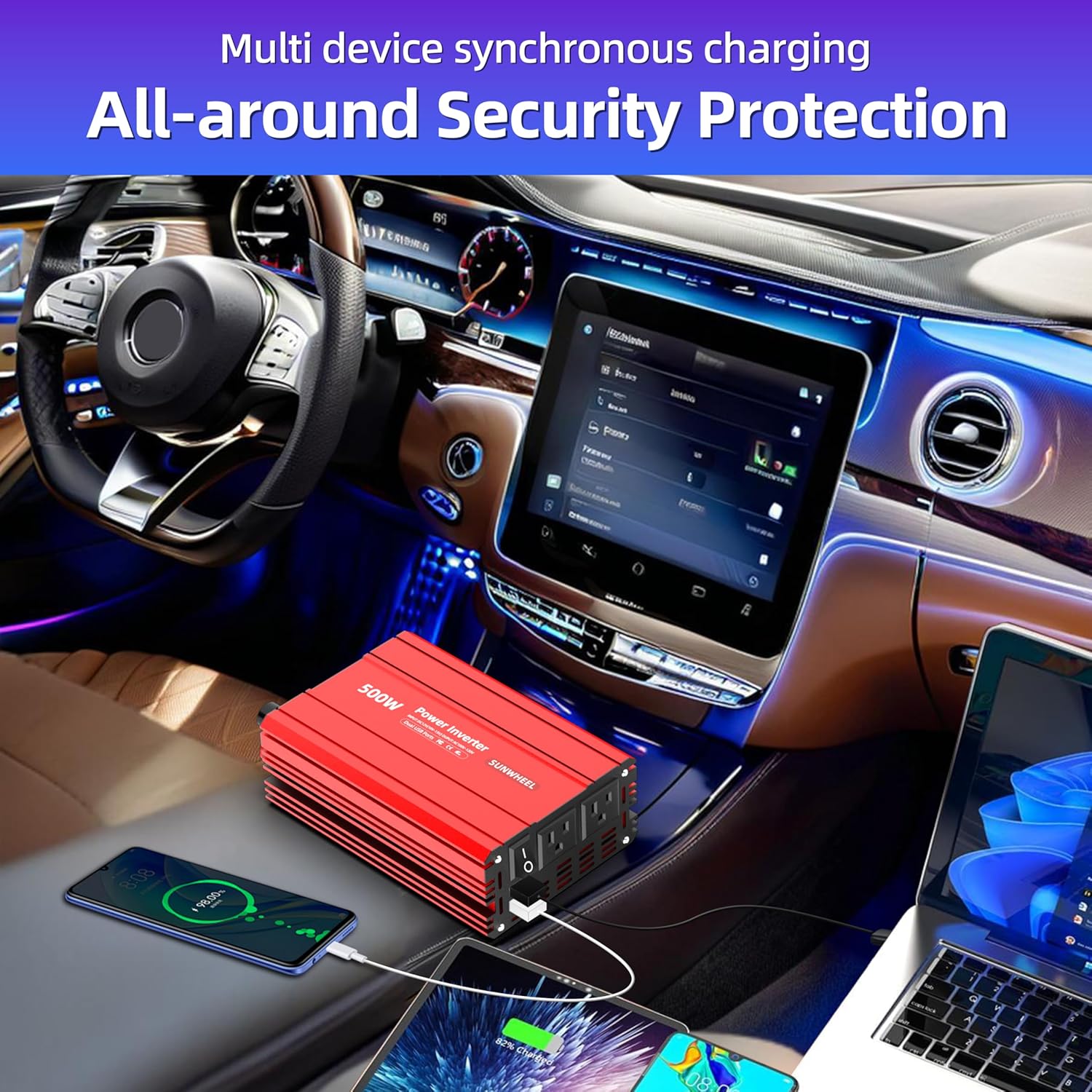 SUNWHEEL 500W Power Inverter DC 12V to 110V AC Car Inverter with 2 x 3.1A USB Ports and Dual AC Outlet, Equipped with 1 Cigarette Lighter and 2 Battery Clamps for Road Trip and Camping
