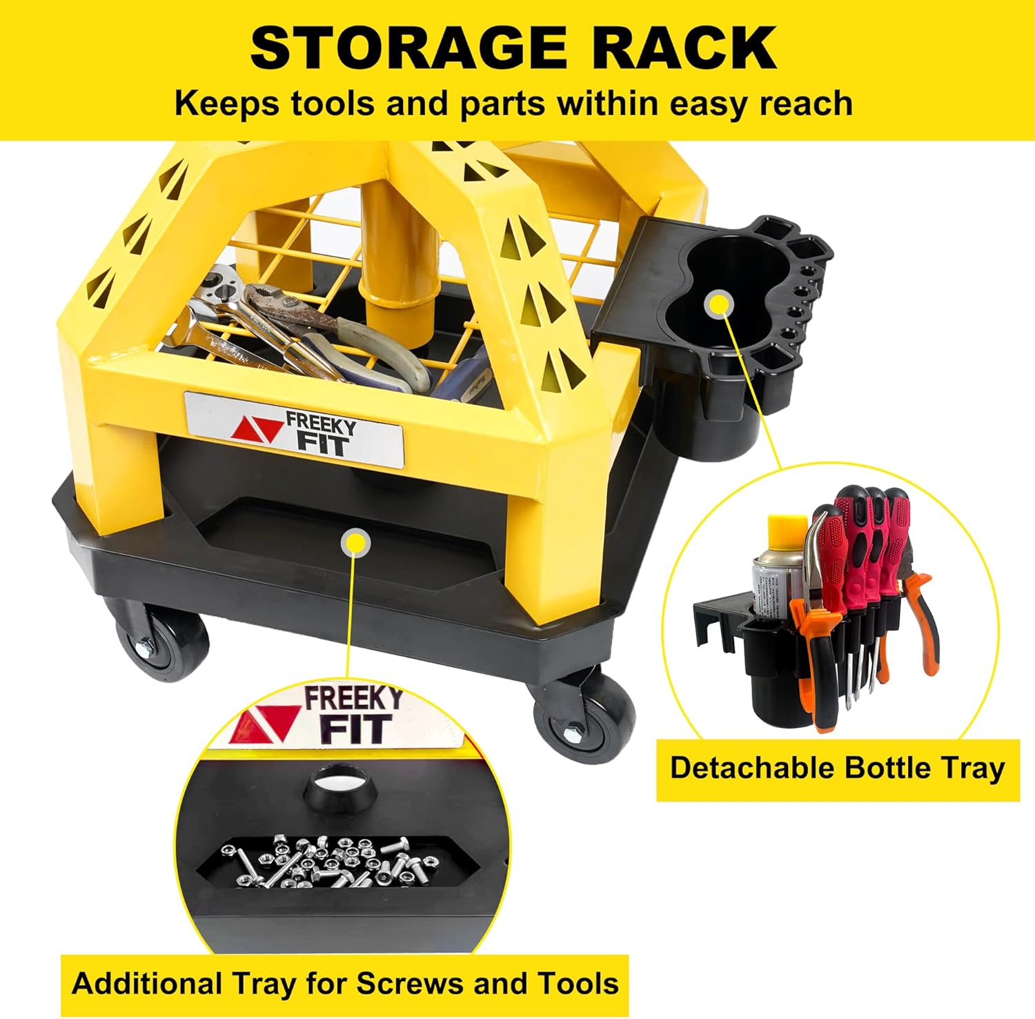 - Engineering Design & High-Storage: Our Rolling Seat with square tube and steel ring structure provides space for resting the feet, and the design of this automotive repair chair includes two tool trays located under the seat. The first layer is a metal mesh tray, and the second layer is a solid plastic tray, making it convenient to store and access necessary tools and parts. In addition, we are also equipped with utility tool rack. It helps to keep the work area tidy and reduces the need for frequent tool movement