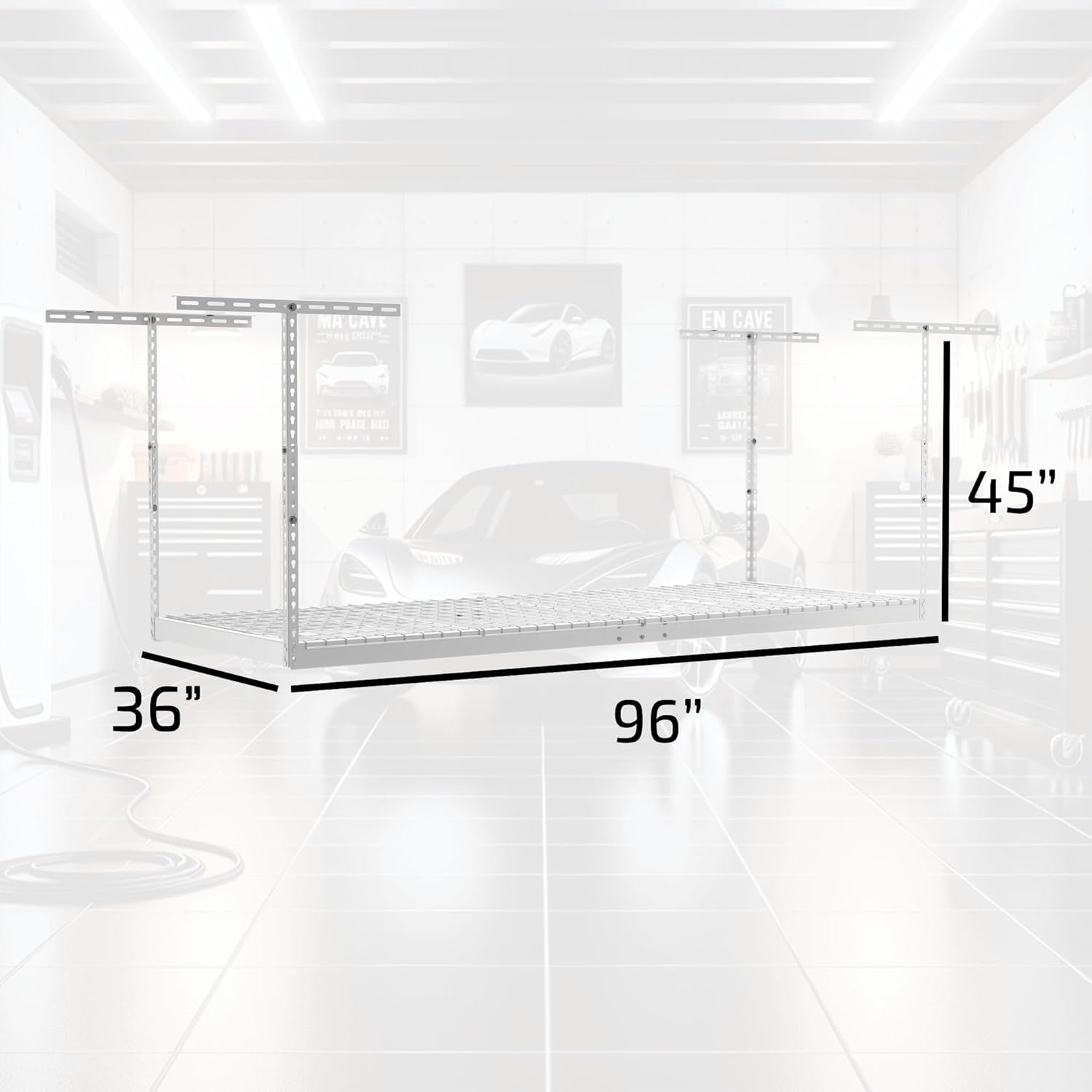 - ADJUSTABLE CEILING HEIGHT: Convert your garage from functionless to functional space. Our ceiling organizer has an adjustable drop-down range letting you customize the distance between the shelf and ceiling from 24" to 45". This 3 foot by 8 foot ceiling-mounted rack adds up to 120 cubic feet of storage.