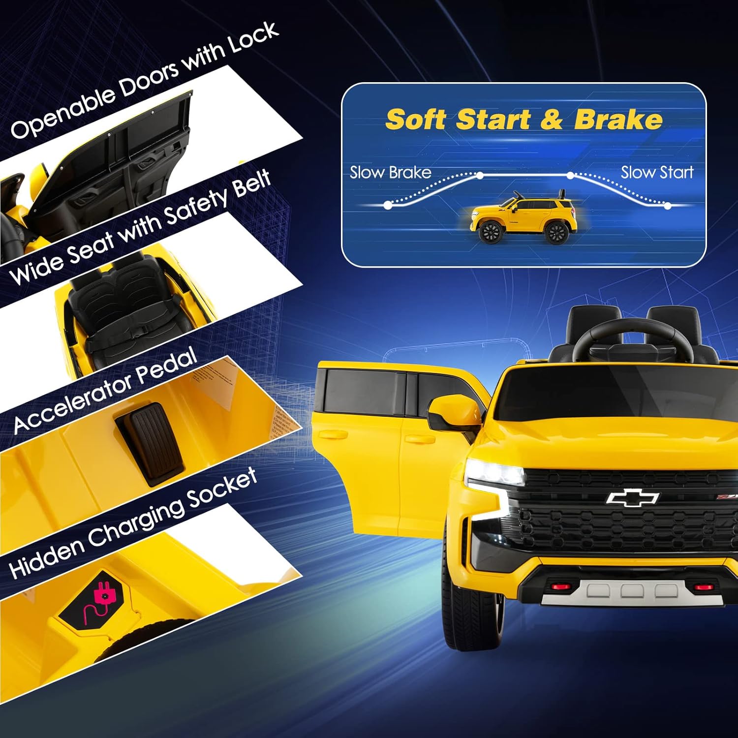 HONEY JOY Ride On Truck, 12V Licensed Chevrolet Tahoe, Chevy Electric Vehicle for Kids, Soft Start, Music, Lights, Battery Powered Ride On Car Toy with Remote Control, Gift for Boys Girls (Yellow)