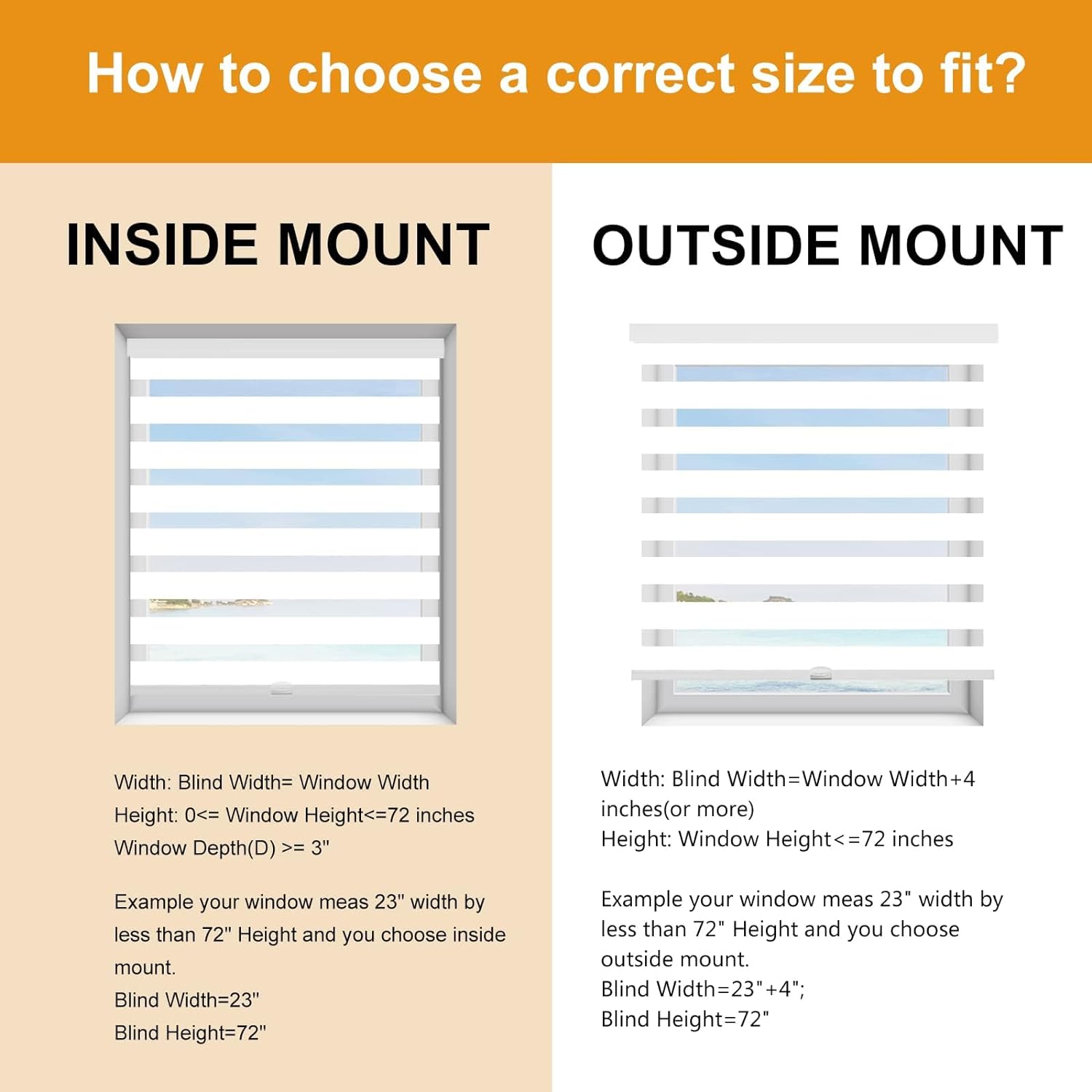 - 【How to choose a correct size to fit? Example your window meas 23" width x less than 72" Height.】INSIDE MOUNT: Window Width is Blind width. Blind Width=23"; Blind Height=72". OUTSIDE MOUNT: Plus at least 4" is blind width, Blind Width=23"+4"=27"; Blind Height=72".【Pls Note】Fabric width will be 0.22" narrower than the size of the blind.