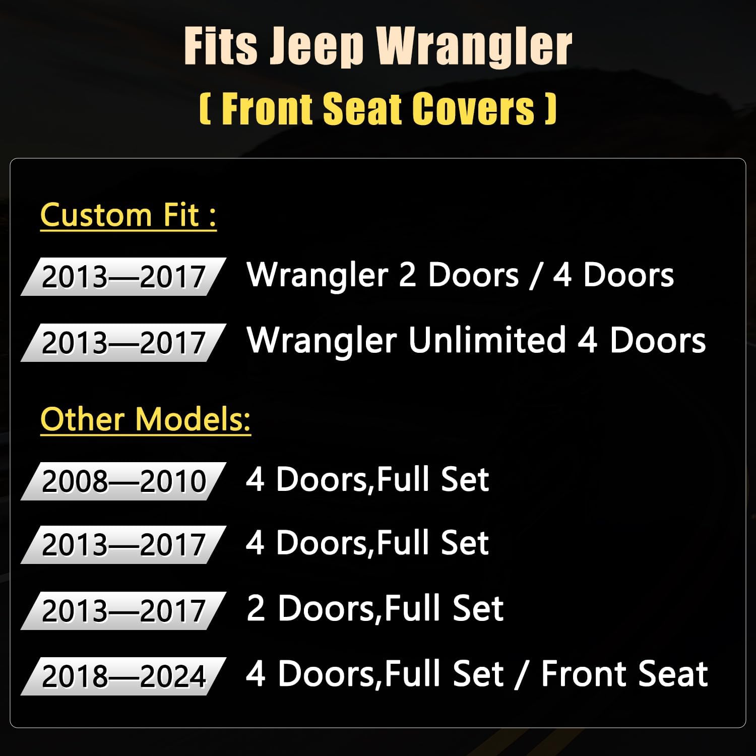 - 【CUSTOM FIT】 - Front seat covers customized according to the original car seat size 1:1, which will fit Wrangler JK 2/4 Door 2013 2014 2015 2016 2017 like a glove.