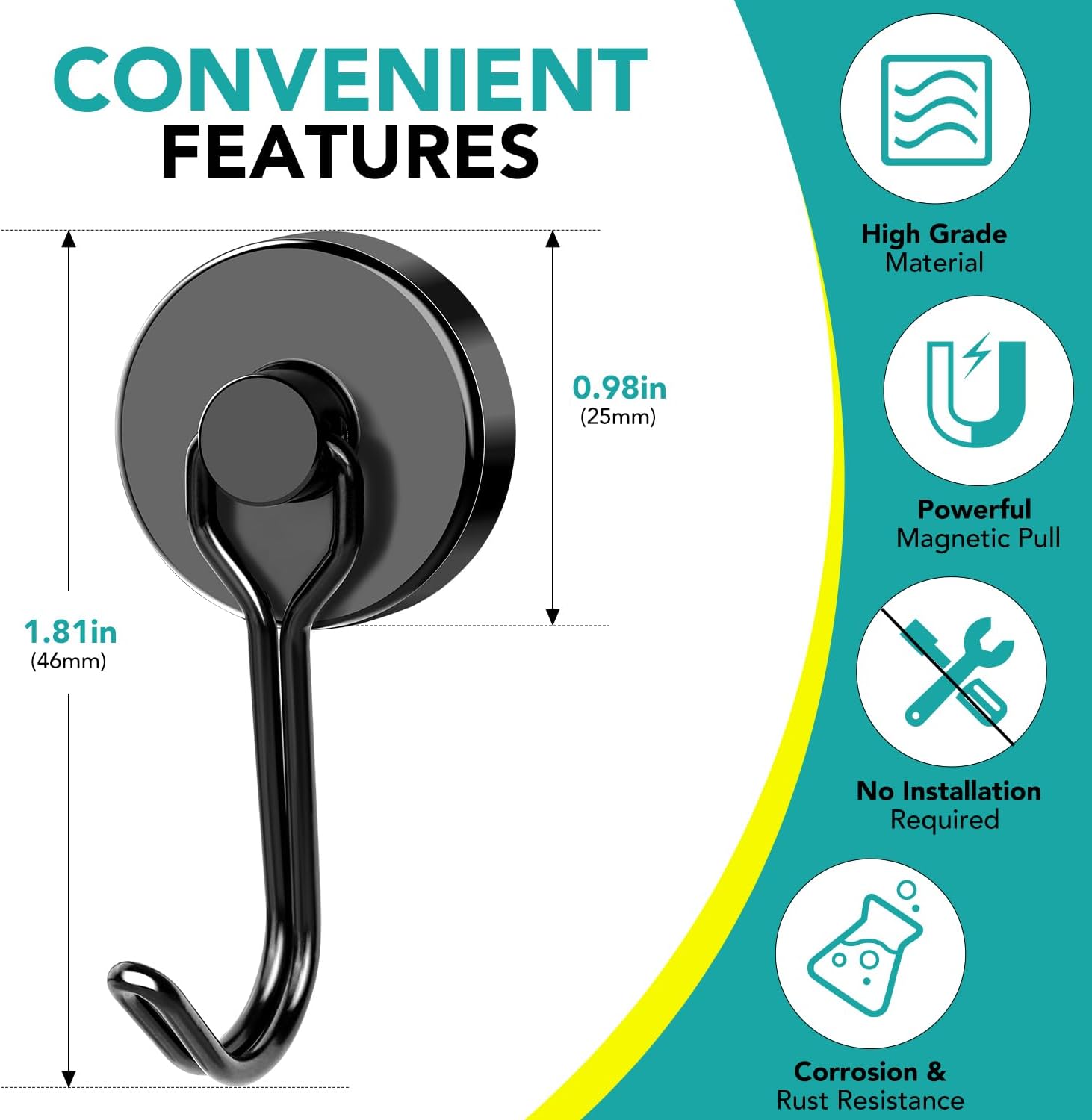 - 【Swivel Magnetic Hooks Set】The package contains 8Pcs black magnetic hooks, each diameter is 0.98inch/25mm, Magnetic hooks 80LBS Capacity is based on horizontal application,and reduced by 2/3 if used vertically