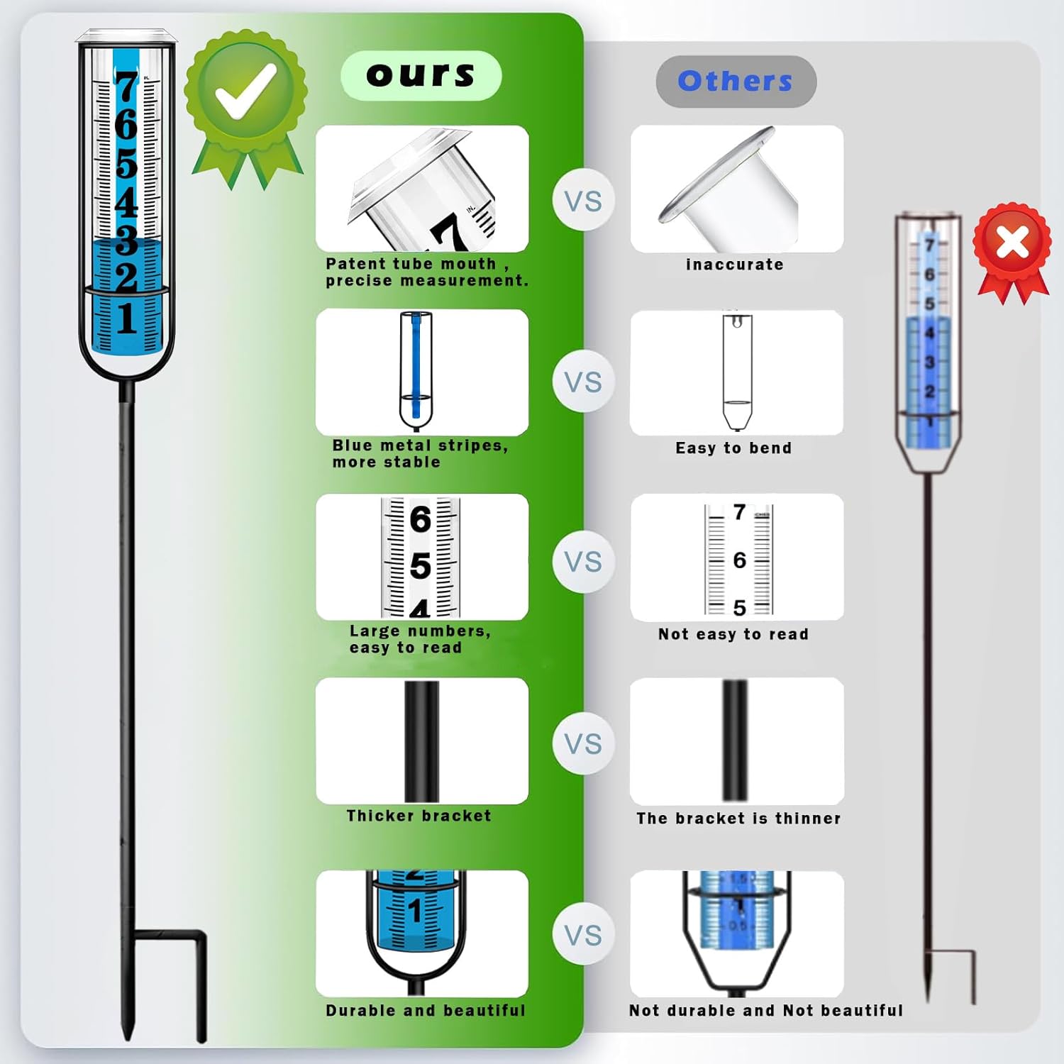 - 【Clearer and Easier to Read】The scale on the rain gauge outdoor tube is upgraded to large font, which is more accurate,clearer and easier to read.Besides,our freeze proof rain gauge adds colored metal strips (patented design) at the rear of the tube to make the water in the rain gauge turn blue, effectively avoiding the problem of unclear water level and scale caused by reflection or transparency. These two novelty designs allow you to see the rainfall from a distance.