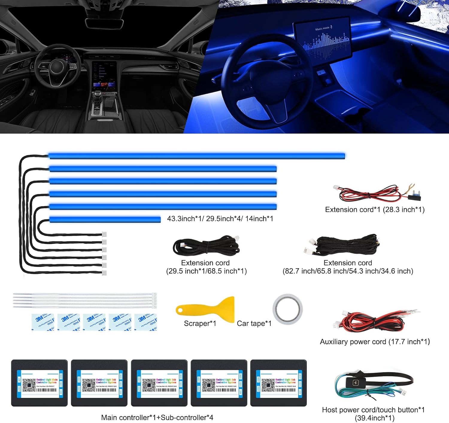 - Included Components : '6 in 1 Acrylic car light kit(4*29.5inch+1*43.3inch+1*14inch), 1*Pry tool'