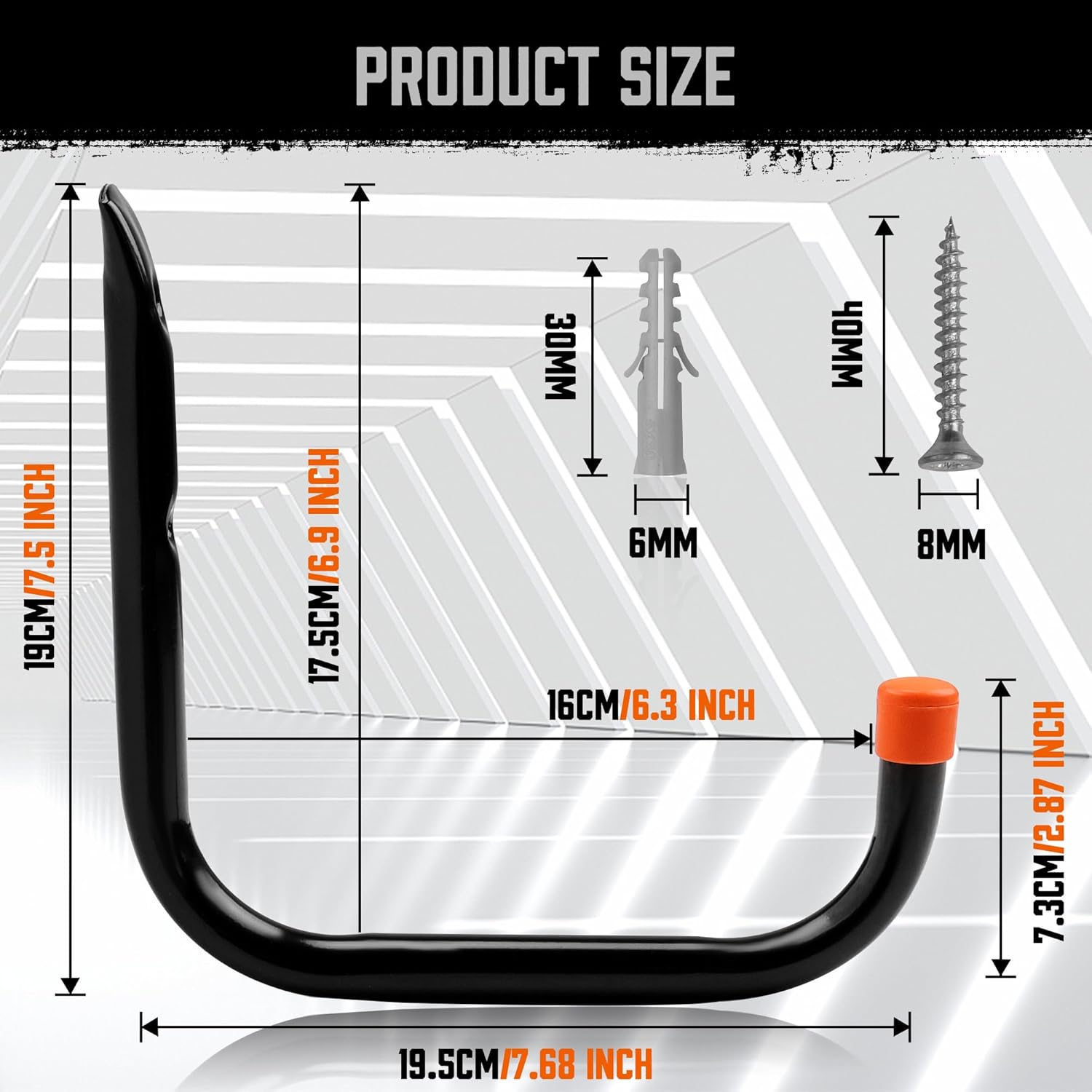 - 6 pack garage storage hooks with 12pcs screws and anchors, hook size: 7.5in x 7.68in(L x W).