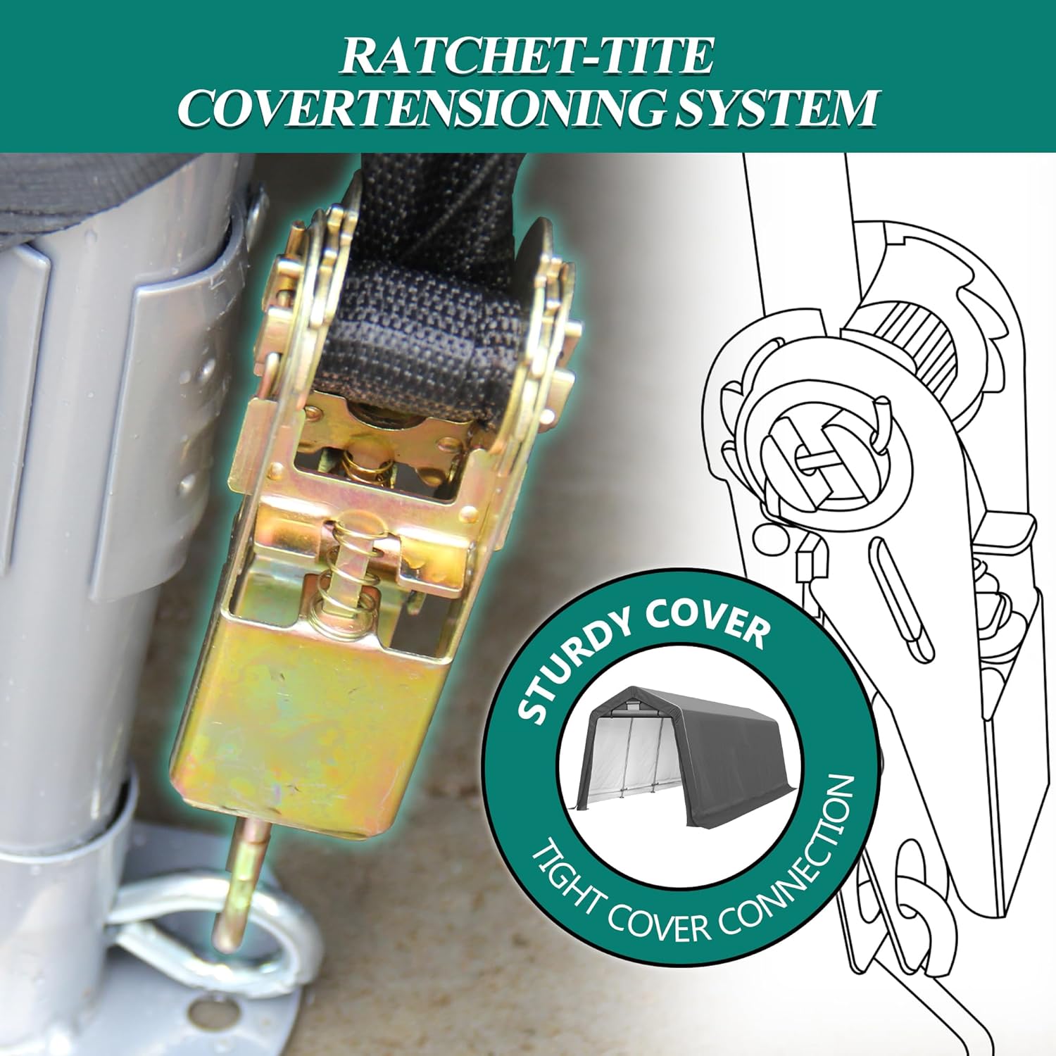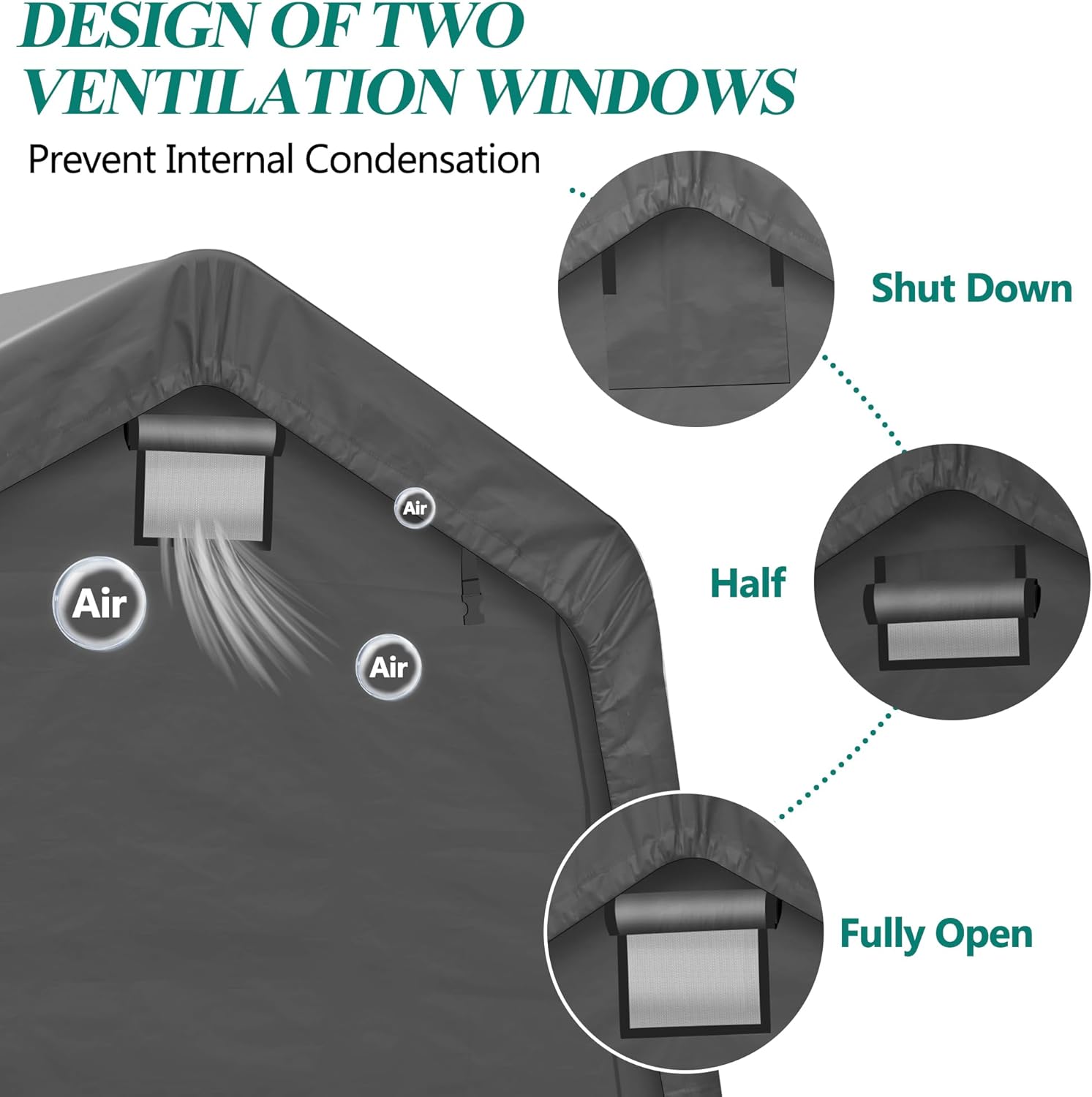- đź§°170G WATERPROOF CANOPY COVER: Our Storage Shelter is made of waterproof 170g PE tarp with Roll-up Ventilation Windows. Heavy-duty Zipper Design